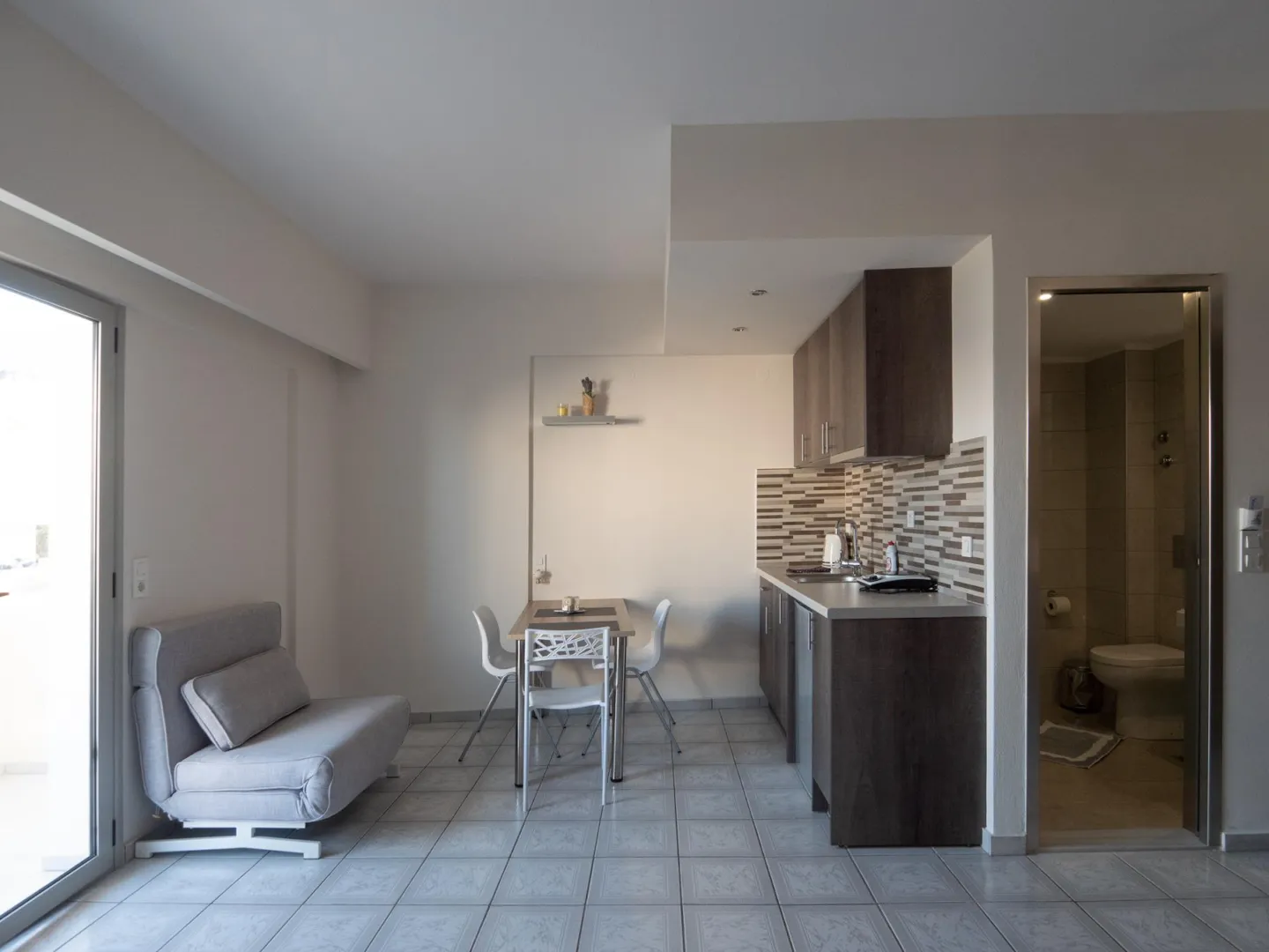 All the apartments were fully renovated in 2018 and consist of an open space area combining the kitchen, dining area, and bedroom. Each apartment has a mini fridge and a private bathroom with a hairdryer. All rooms at Aristo Apartments open to a balcony with outdoor furniture. There is a roof sun terrace with a view of the sea, city, and mountains.