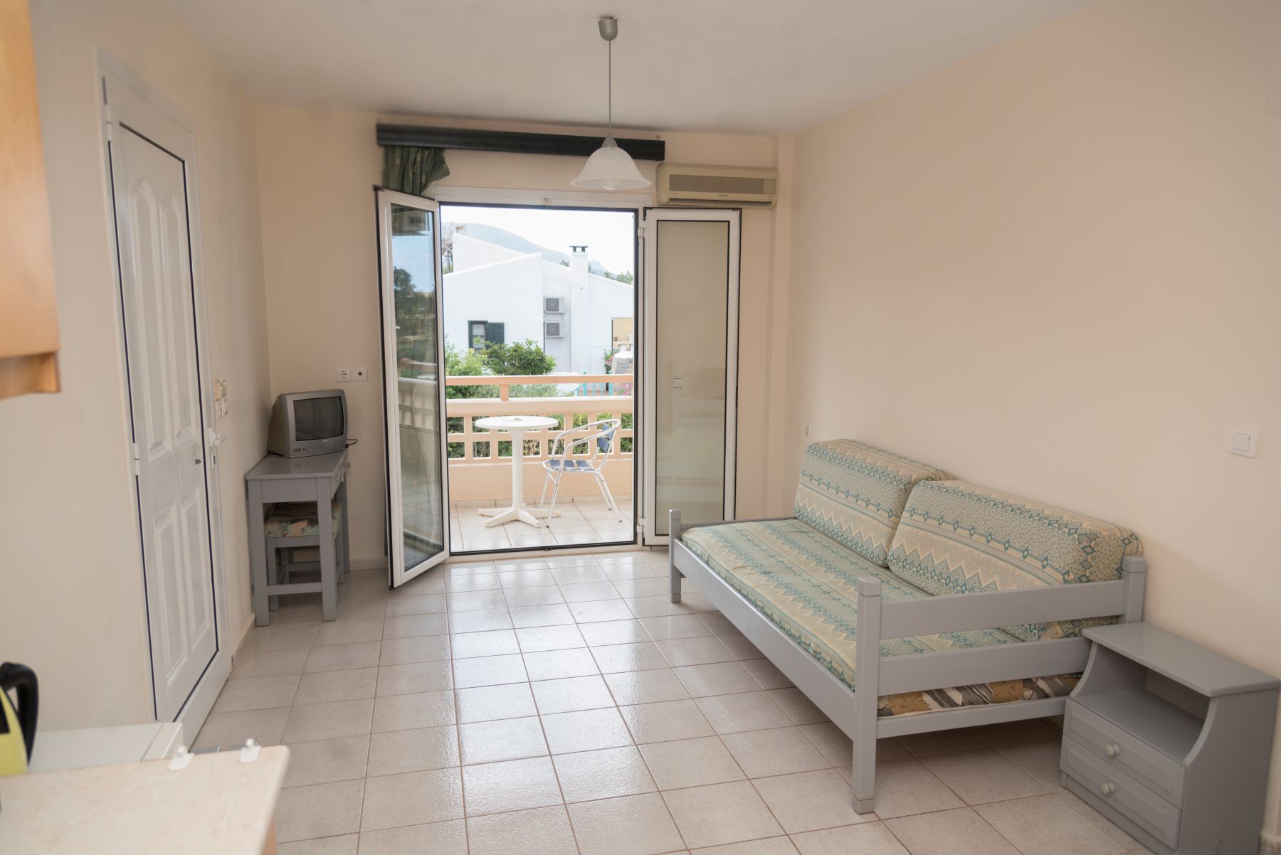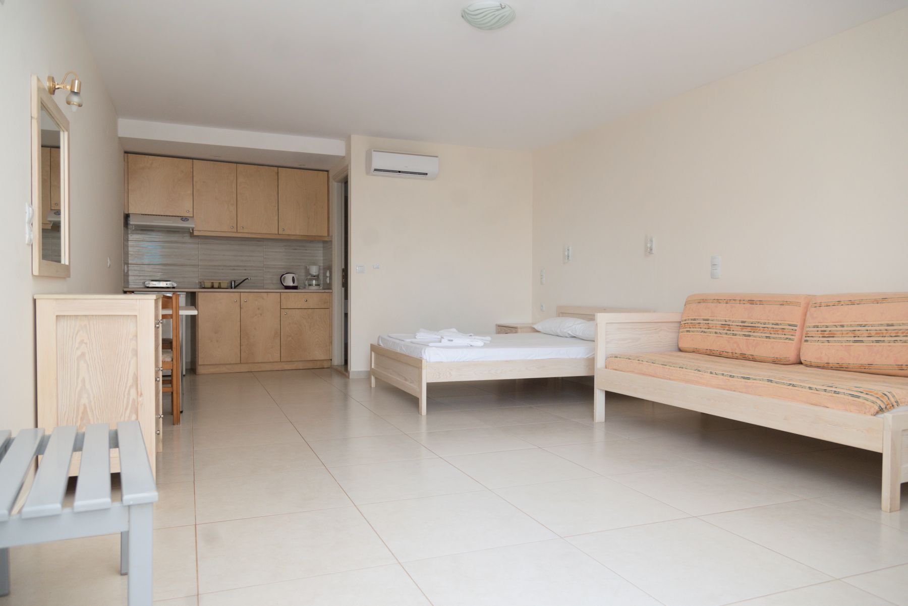 Sunset Apartments in Malia offers family rooms with air-conditioning, kitchenettes, balconies, and private bathrooms. Each unit includes a dining table, sofa bed, and modern amenities such as a coffee machine and refrigerator.