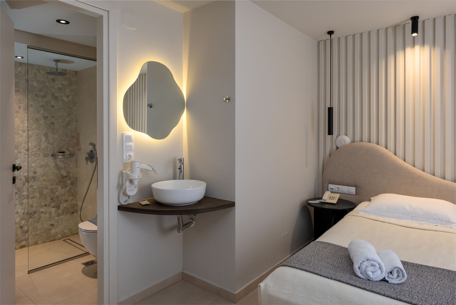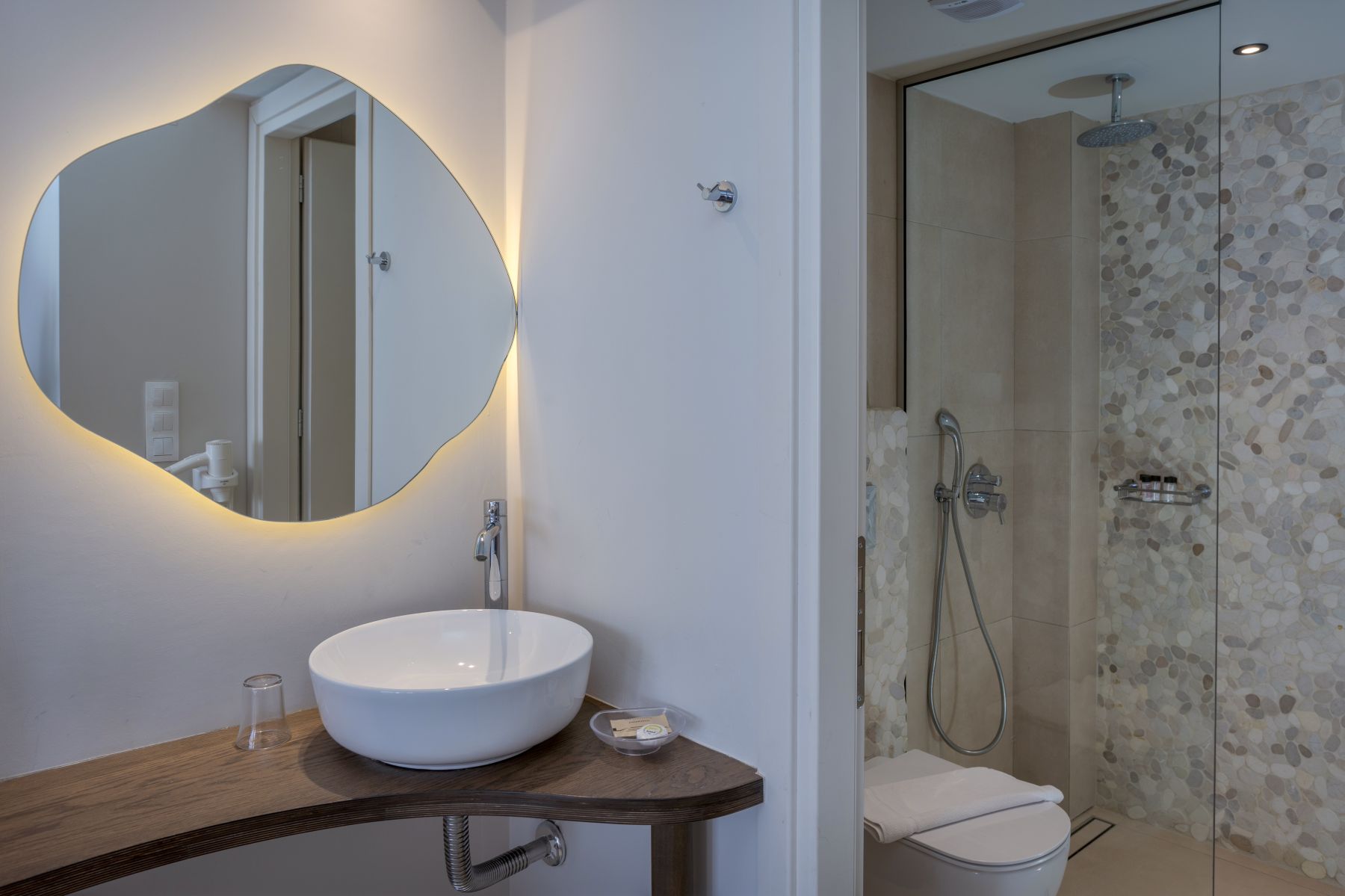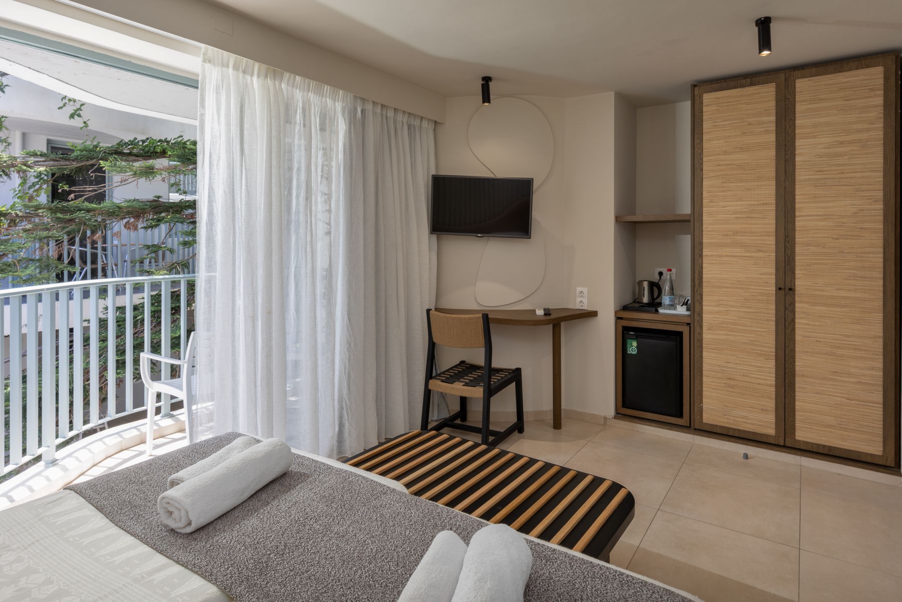 Sophisticated & elegant. The fully renovated Junior Suites with boho style furniture exudes a sense of discreet luxury. The spacious and modern bathroom comes equipped with a rainfall shower cabin, bathrobes, slippers and luxurious bathroom amenities in order to guarantee an ultimate relaxation. Junior Suites are located starting from the 1st till the 3rd floor and feature a private balcony or terrace with magnificent views of the sea.
