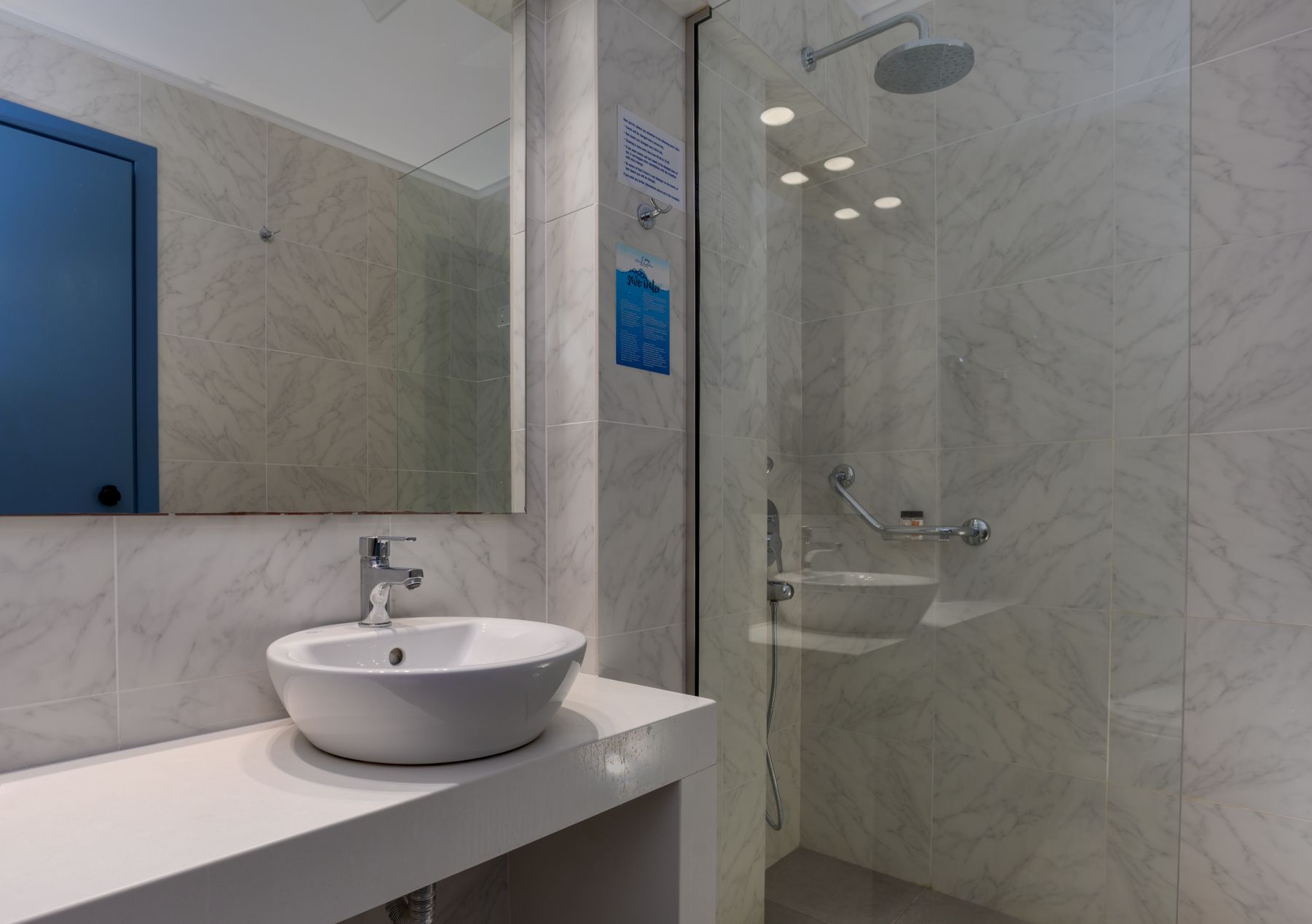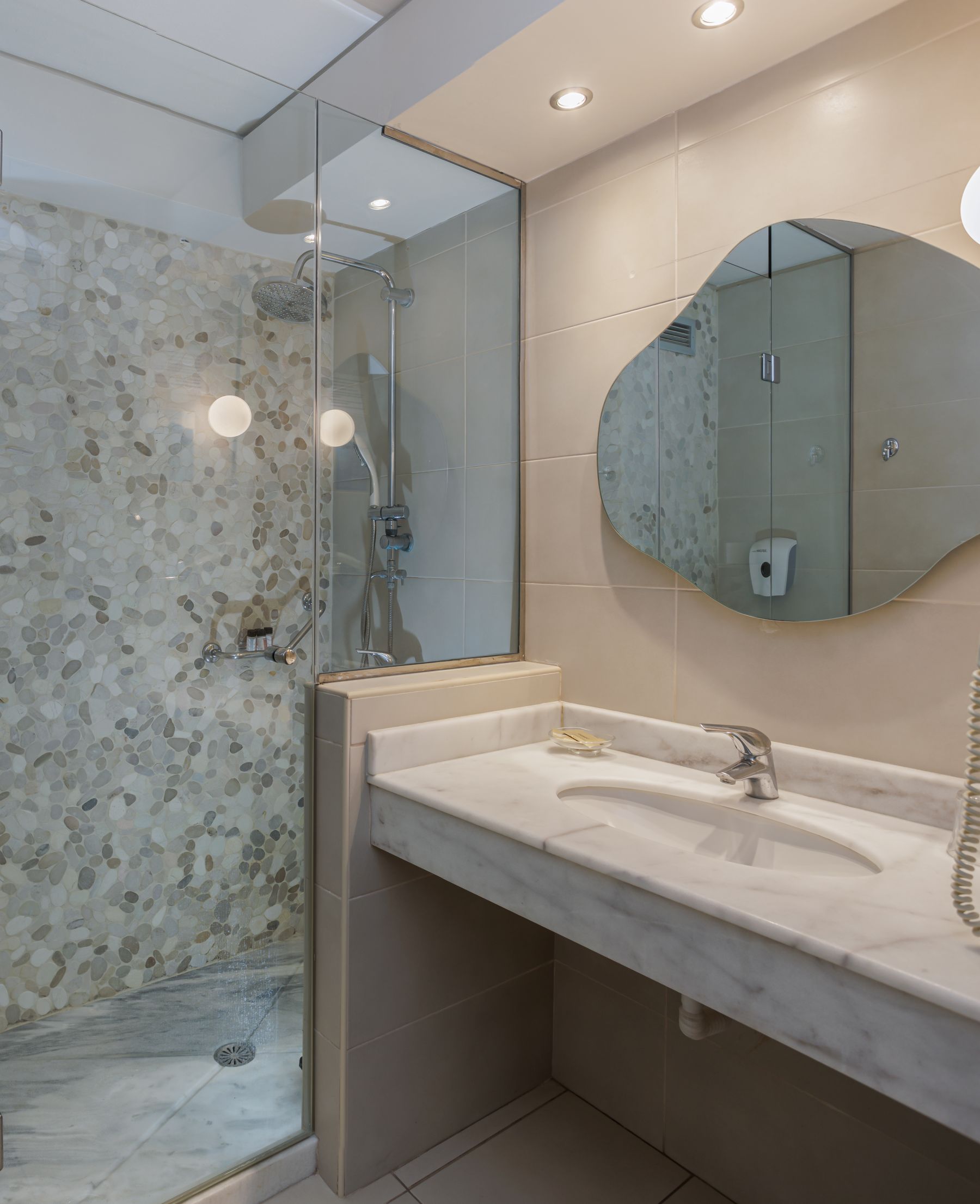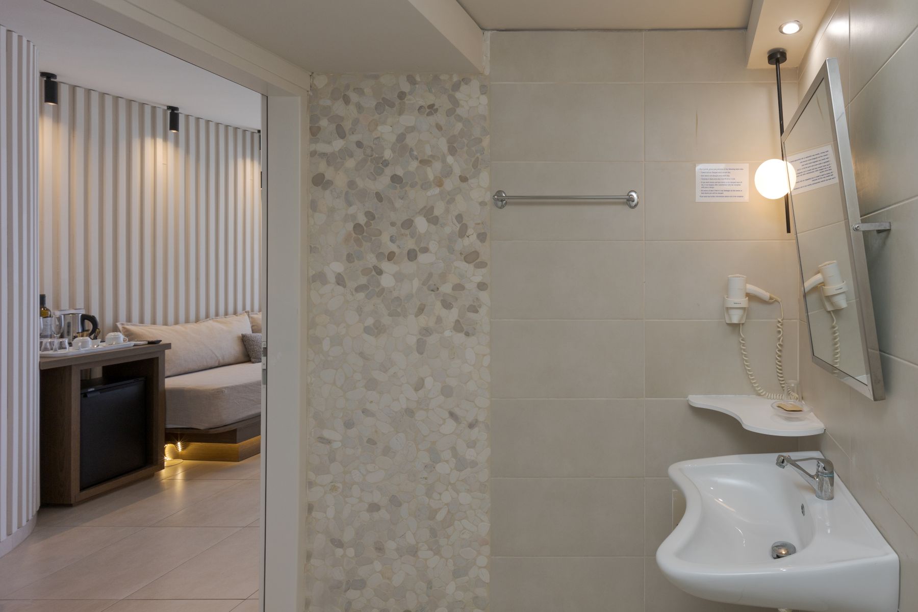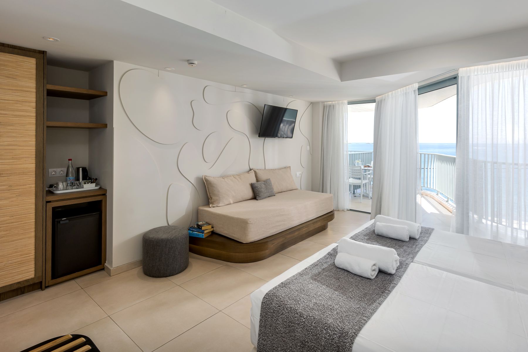 These spacious rooms feature a bedroom with double or twin-size beds and premium Cocomat mattresses, and are equipped with tea and coffee making facilities, mini fridge, in-room safe deposit box, direct dial telephone, flat screen TV with satellite channels and music programs and individually controlled air-condition. The bathroom is spacious and has a rainfall shower cabin, hairdryer, magnifying mirror and complimentary bathroom amenities. From the furnished balcony guests can enjoy partial views of the sea and the surrounding area of the hotel.