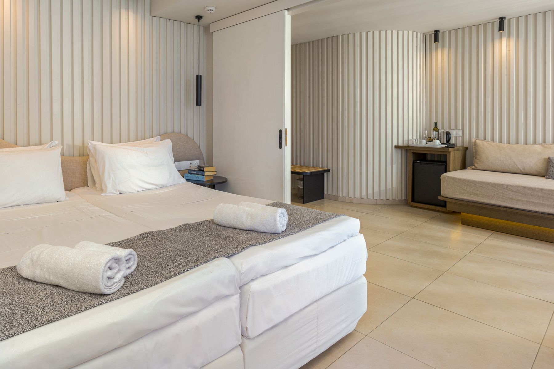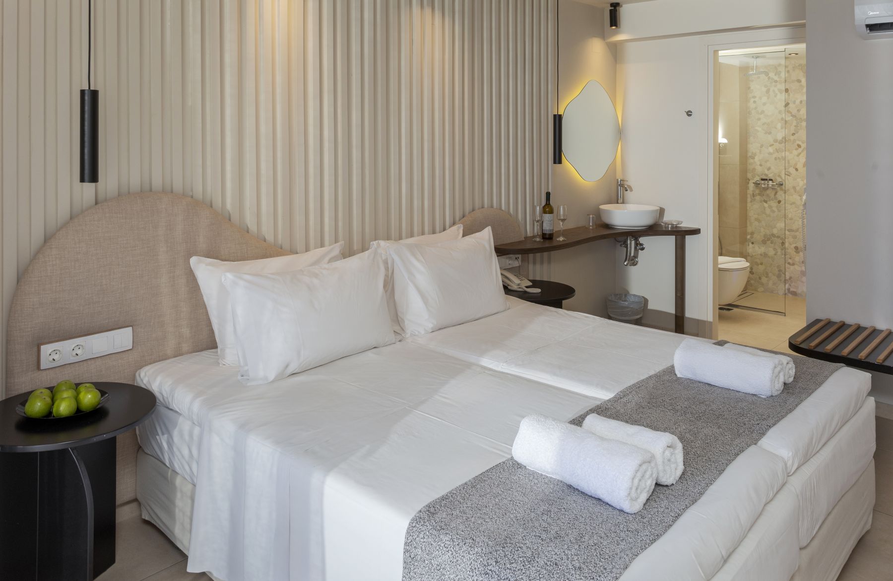 Spacious, sophisticated & elegant. The fully renovated Superior Suites with boho style furniture give the room a distinctive luxury. The spacious and modern bathroom comes equipped with a rainfall shower cabin, bathrobes, slippers and luxurious bathroom amenities in order to guarantee an ultimate relaxation. It also features a living area with a modern and comfortable sofa and a desk. Superior Suites are located starting from the 1st till the 3rd floor and feature a private balcony or terrace with magnificent views of the sea.