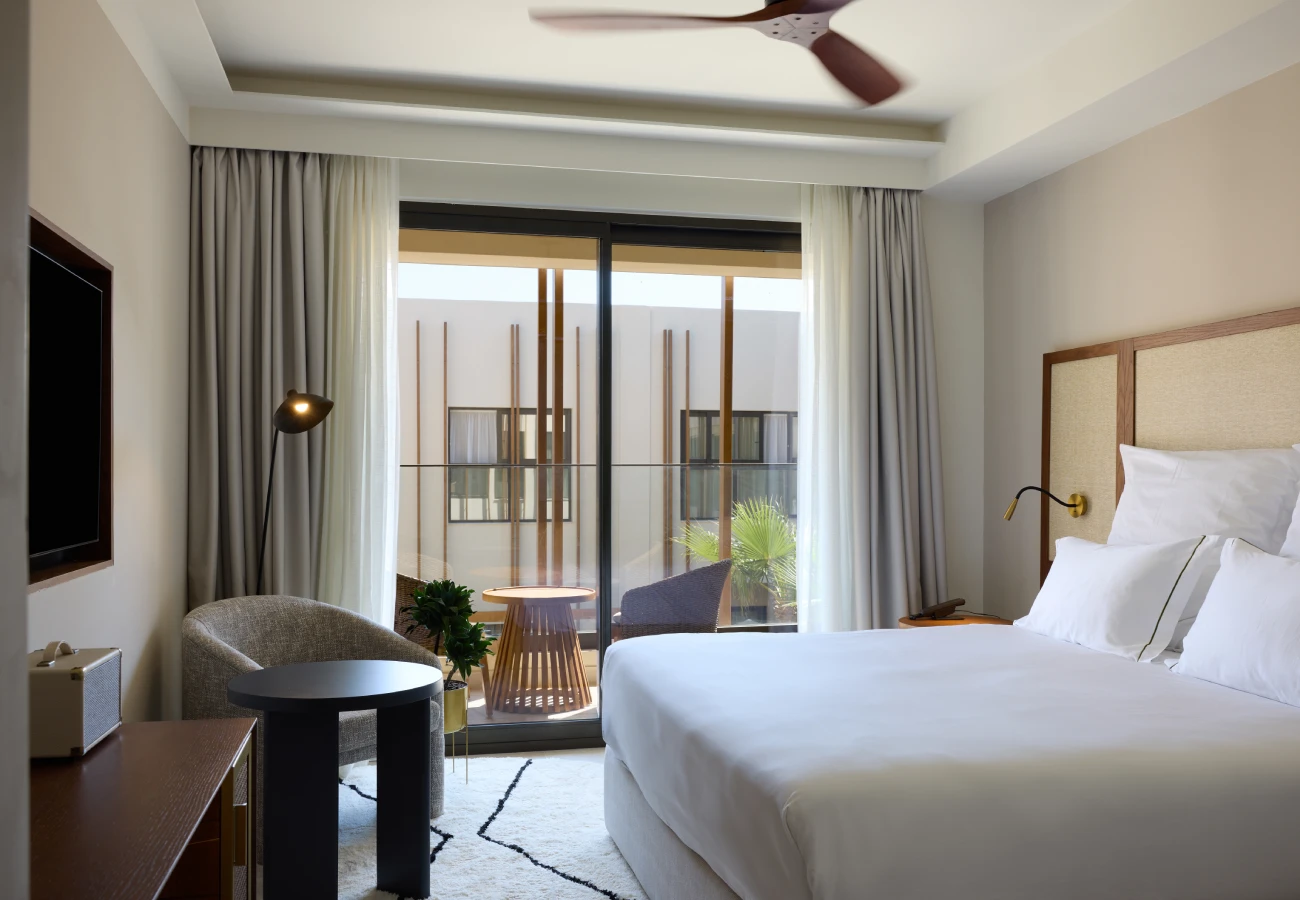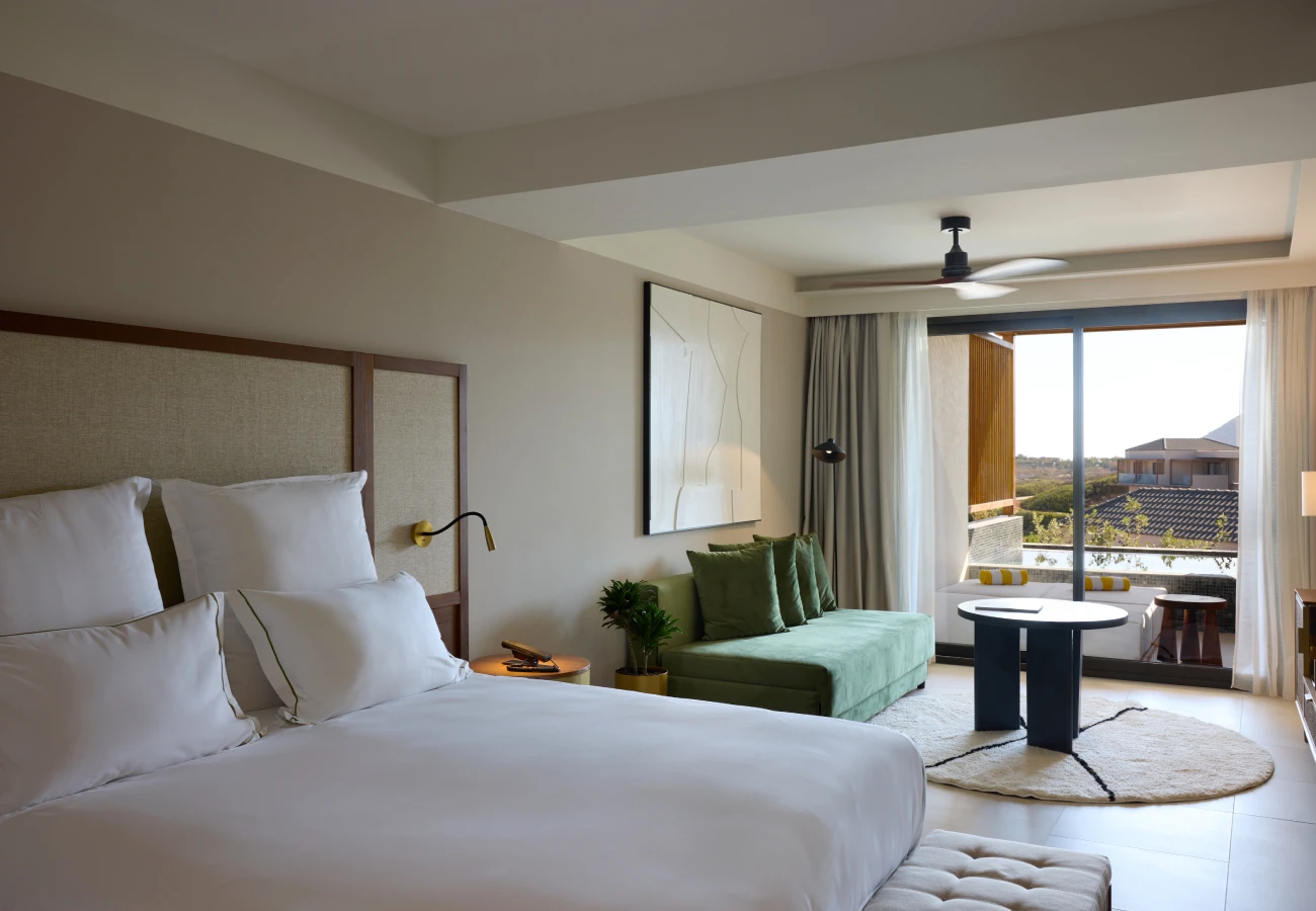 Located in bungalow setting. Accommodates up to 3 adults. Set among lush tropical gardens, this open-plan suite blends natural tones with effortless comfort. Step out to a shared pool from a private veranda or unwind indoors with a soothing palette, plush bedding, complimentary minibar, and thoughtful amenities designed for laid-back Cretan days.