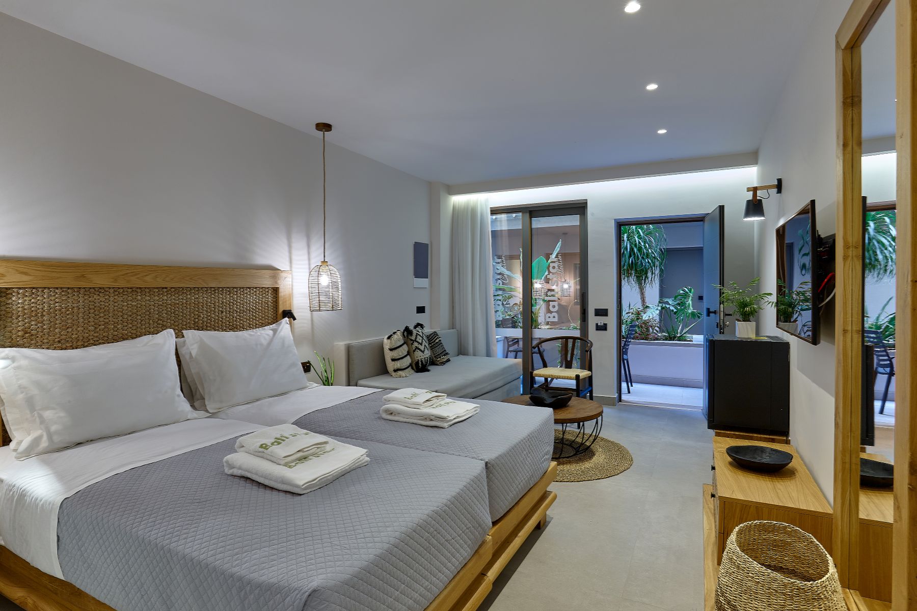 Spacious and comfortable, with minimal and modern decoration, with fittings that are functional and pleasing to the eye, the rooms of Bali Star Hotel will win you over immediately. The double rooms are fitted with two single beds or a double bed, a bathroom and are ideal for couples wishing to relax and rejuvenate. The garden view evokes a sense of tranquility with colors from Greek nature’s palette.
