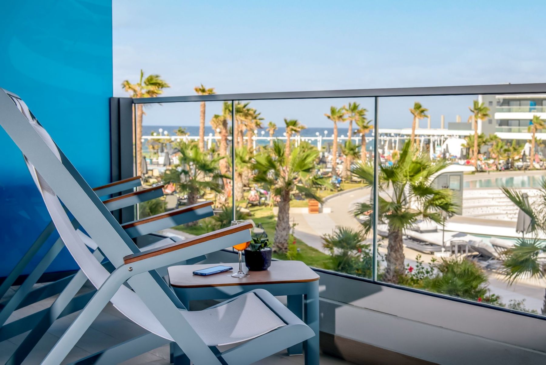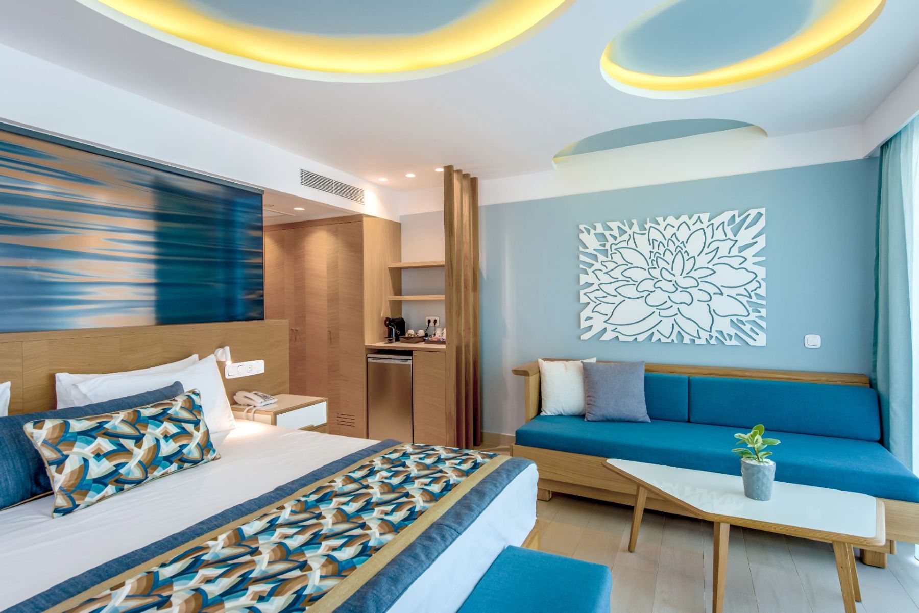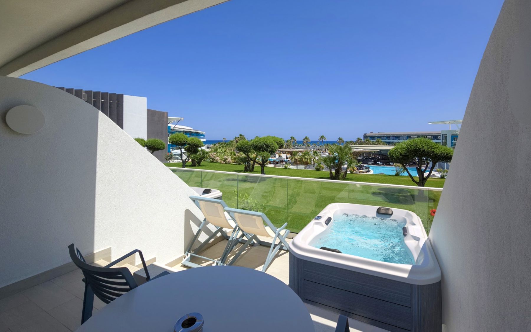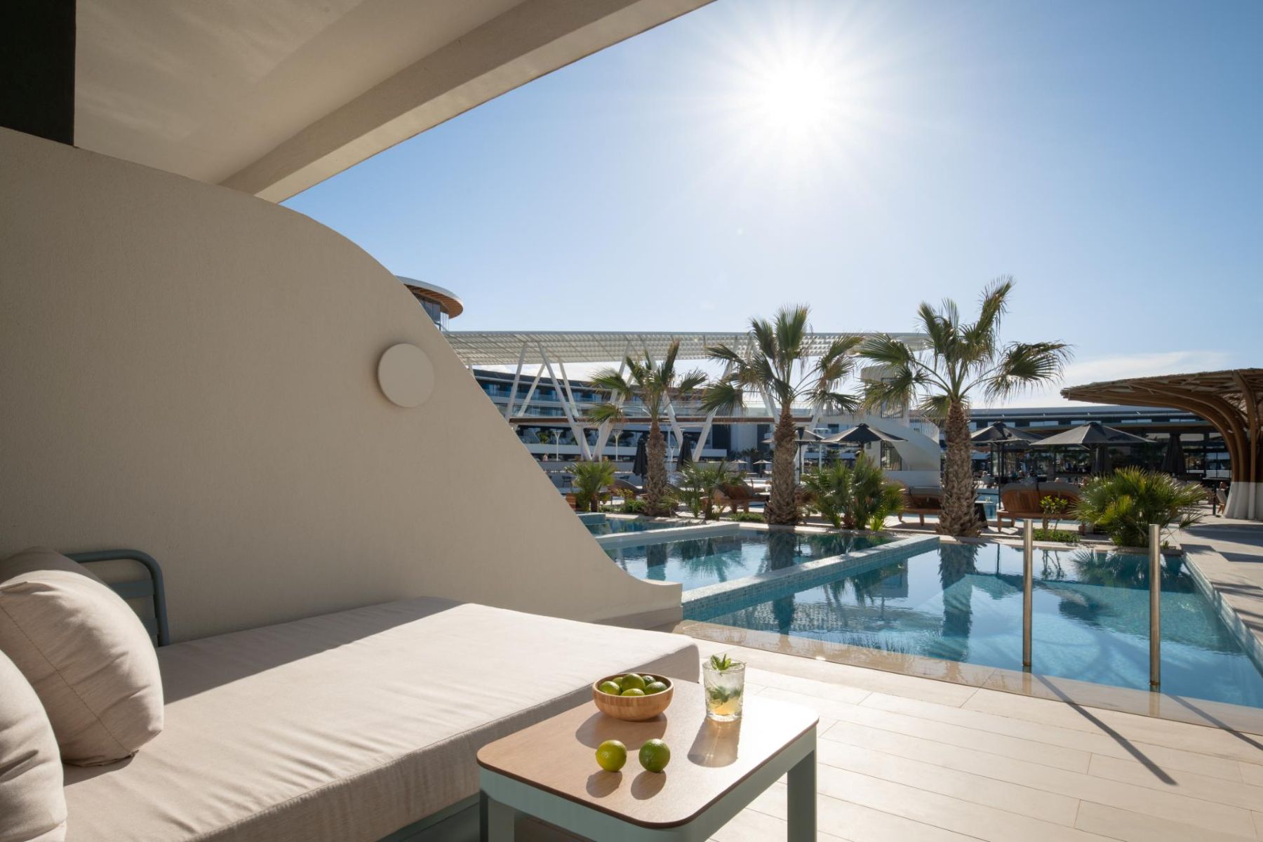 Spacious with modern interiors that blend seamlessly with the light and colors of the Mediterranean, providing guests with a memorable stay. Each suite designed to offer a comfort features one private bedroom with a double bed, a lounge area with a full-sized sofa bed, and a luxurious bathroom with a walk-in shower. Step outside a private furnished balcony, take in the sea breeze and enjoy the beautiful vistas of the sea or the resort’s flowing pools.