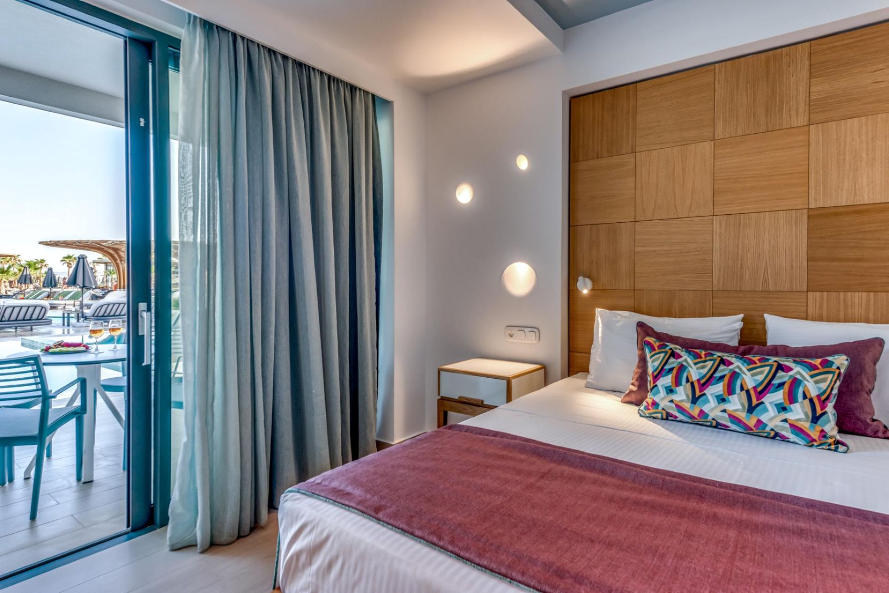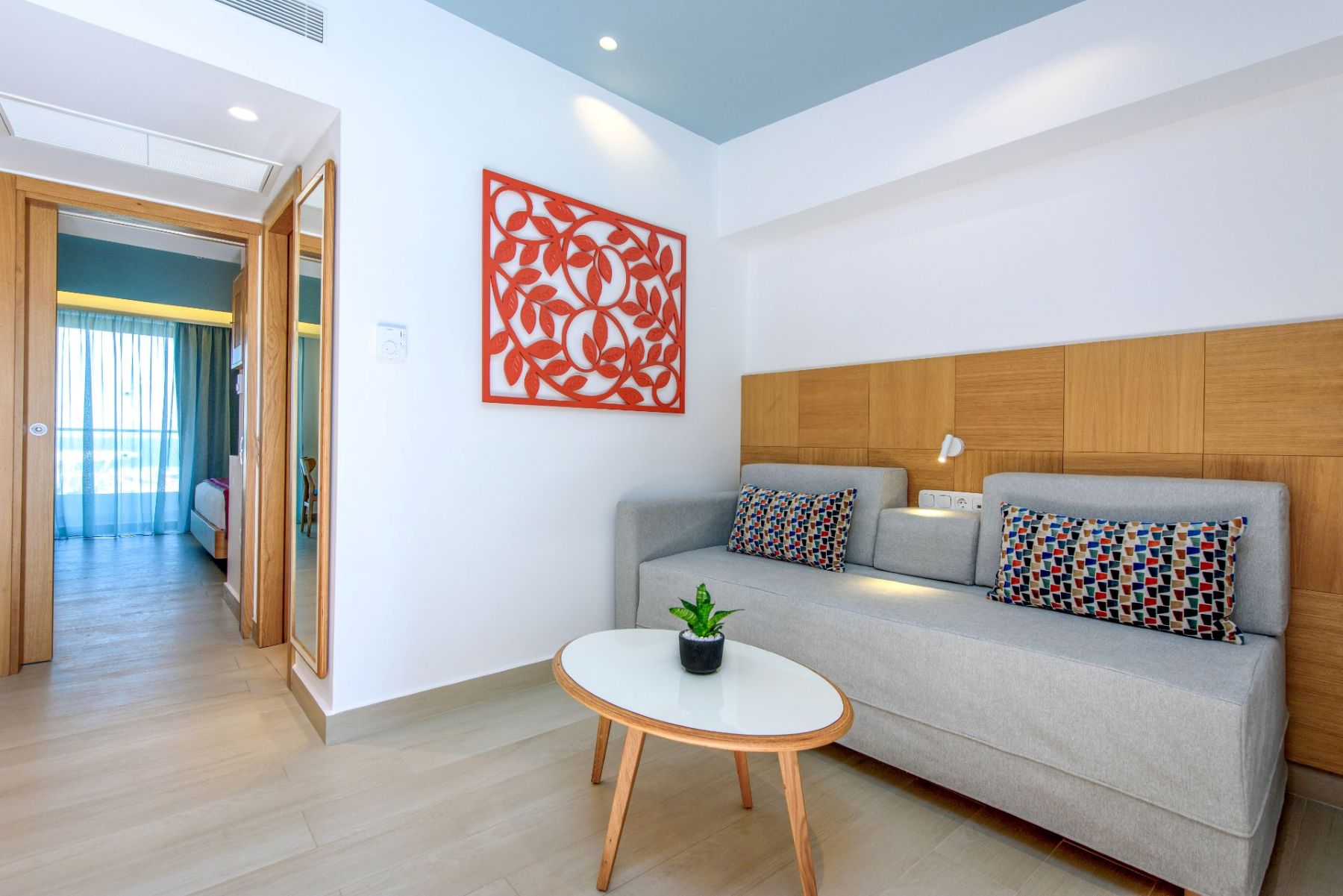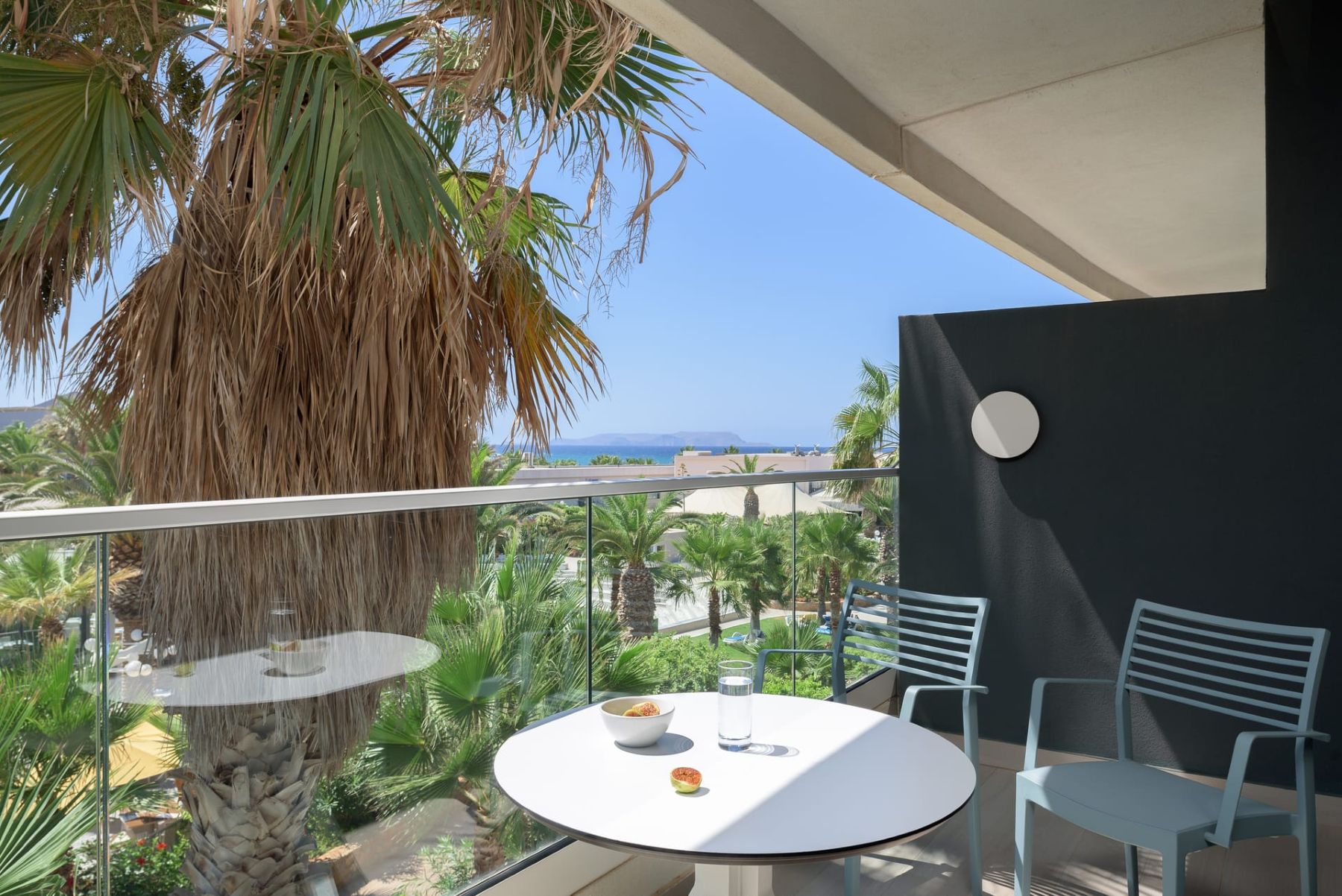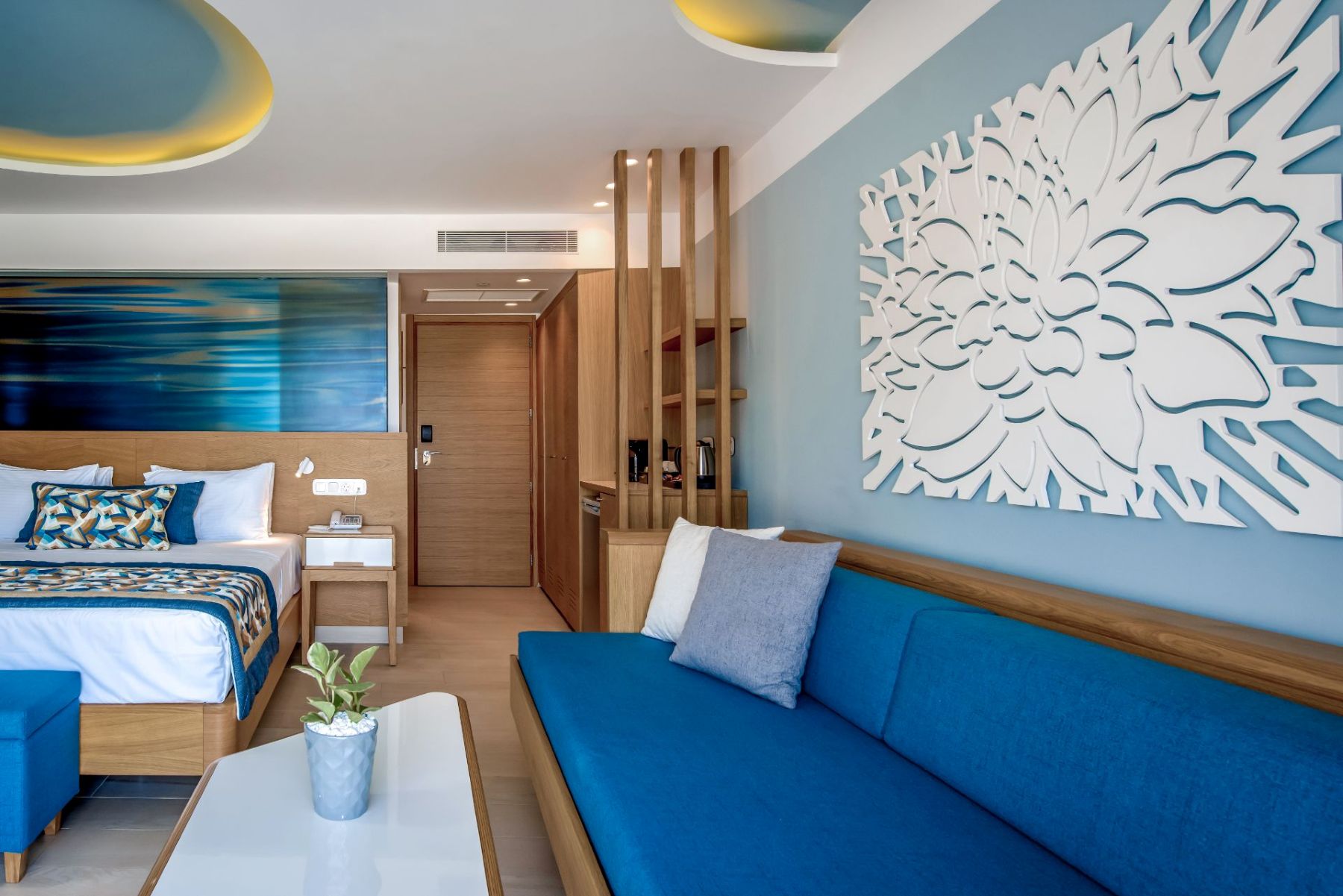 Spacious with modern interiors that blend seamlessly with the light and colors of the Mediterranean, providing guests with a memorable stay. Each suite designed to offer a comfort features one private bedroom with a double bed, a lounge area with a full-sized sofa bed, and a luxurious bathroom with a walk-in shower. Step outside a private furnished balcony, take in the sea breeze and enjoy the beautiful vistas of the sea or the resort’s flowing pools.