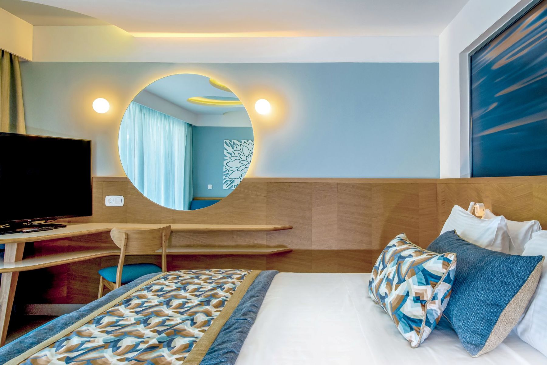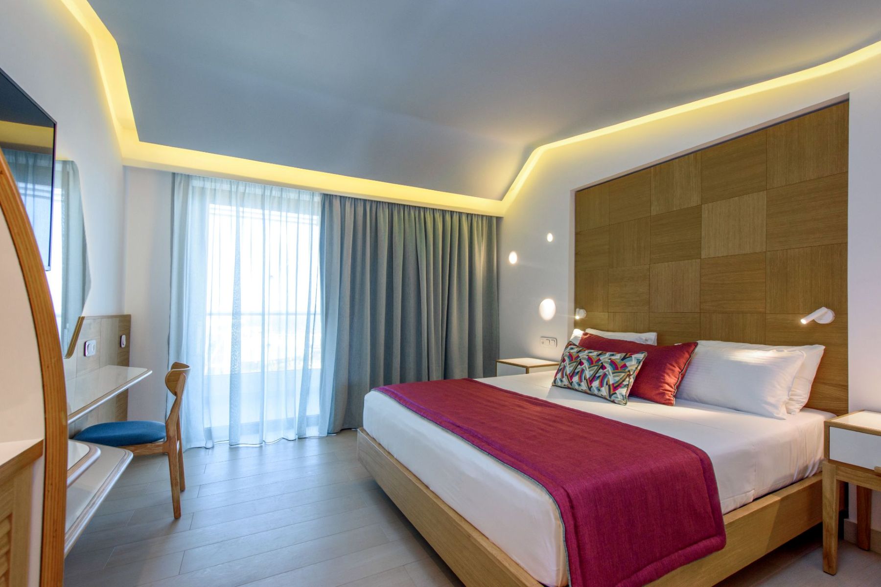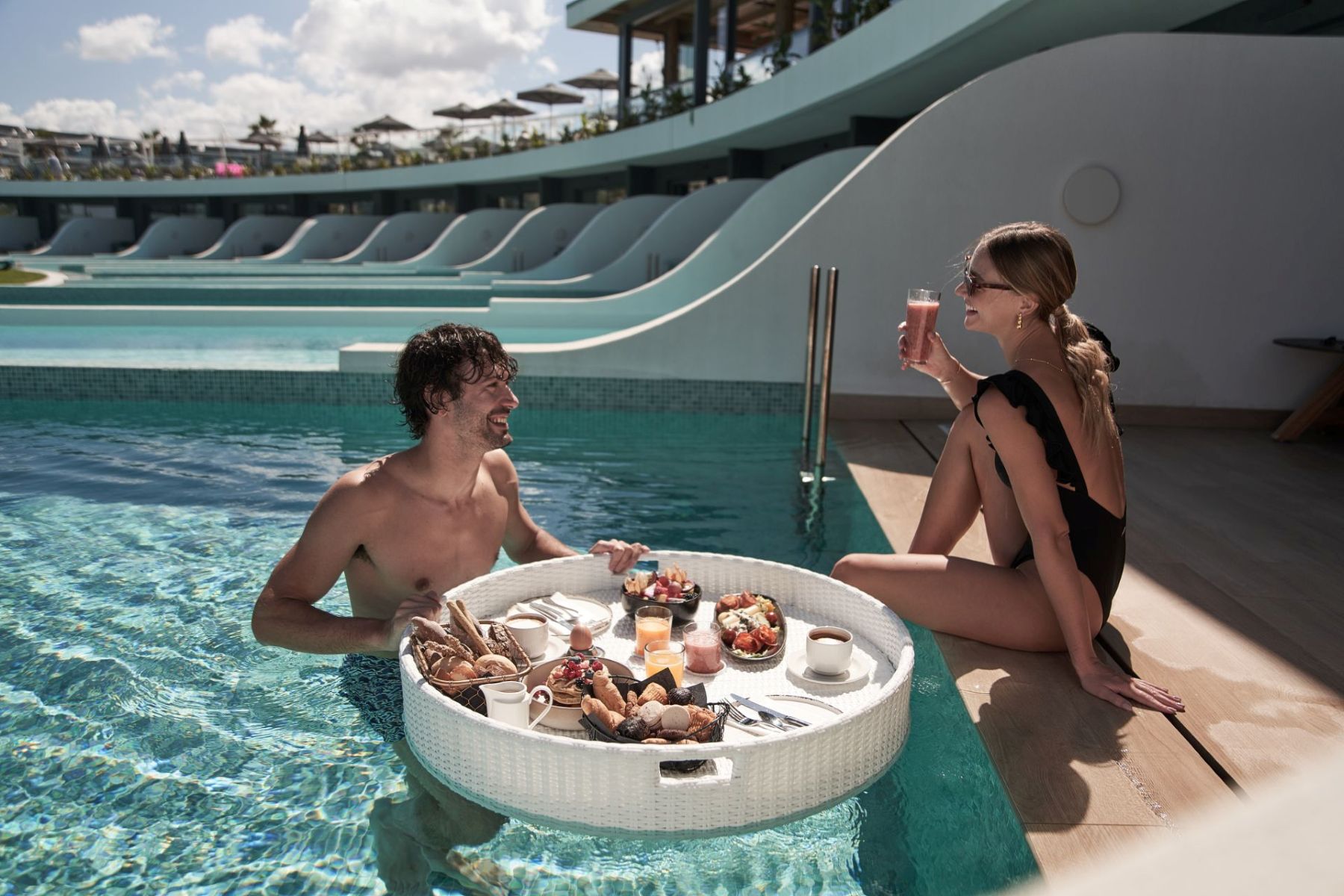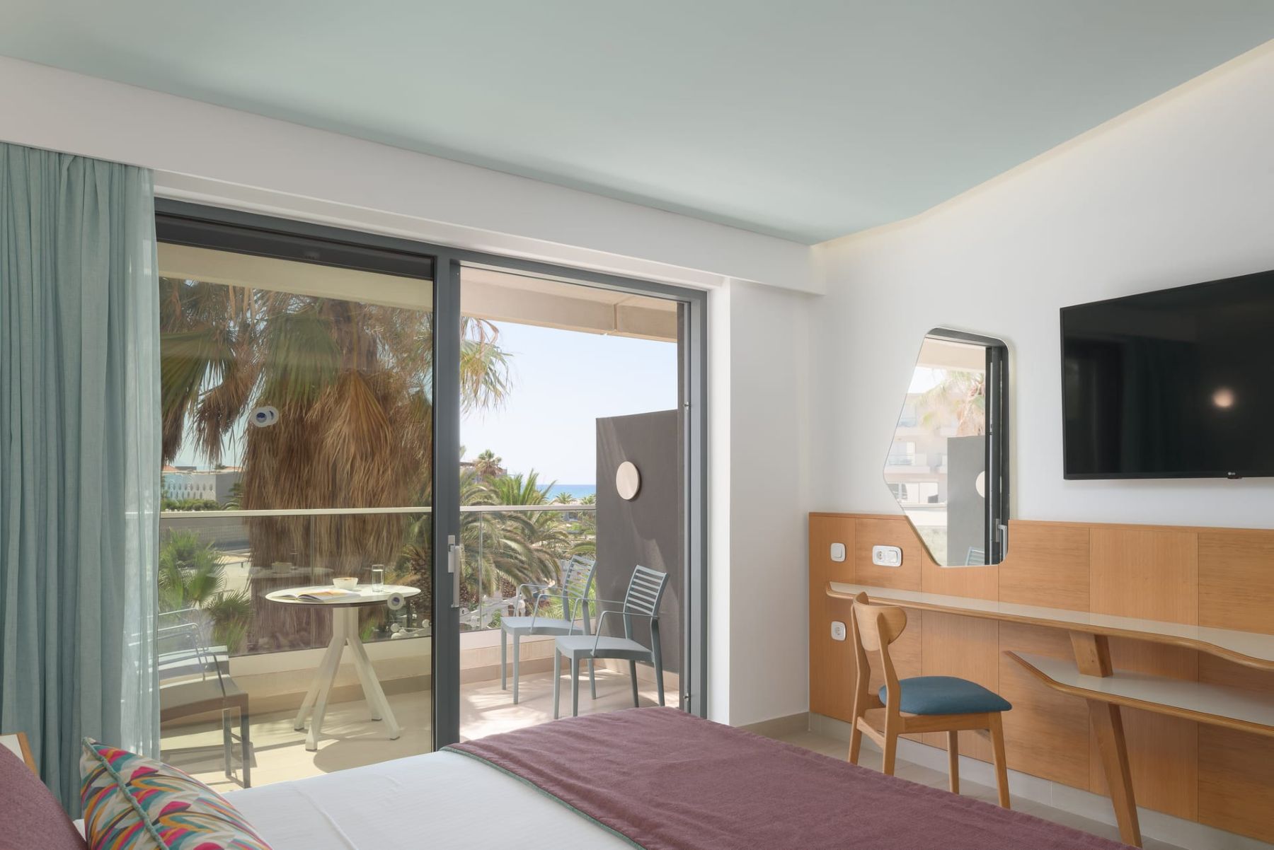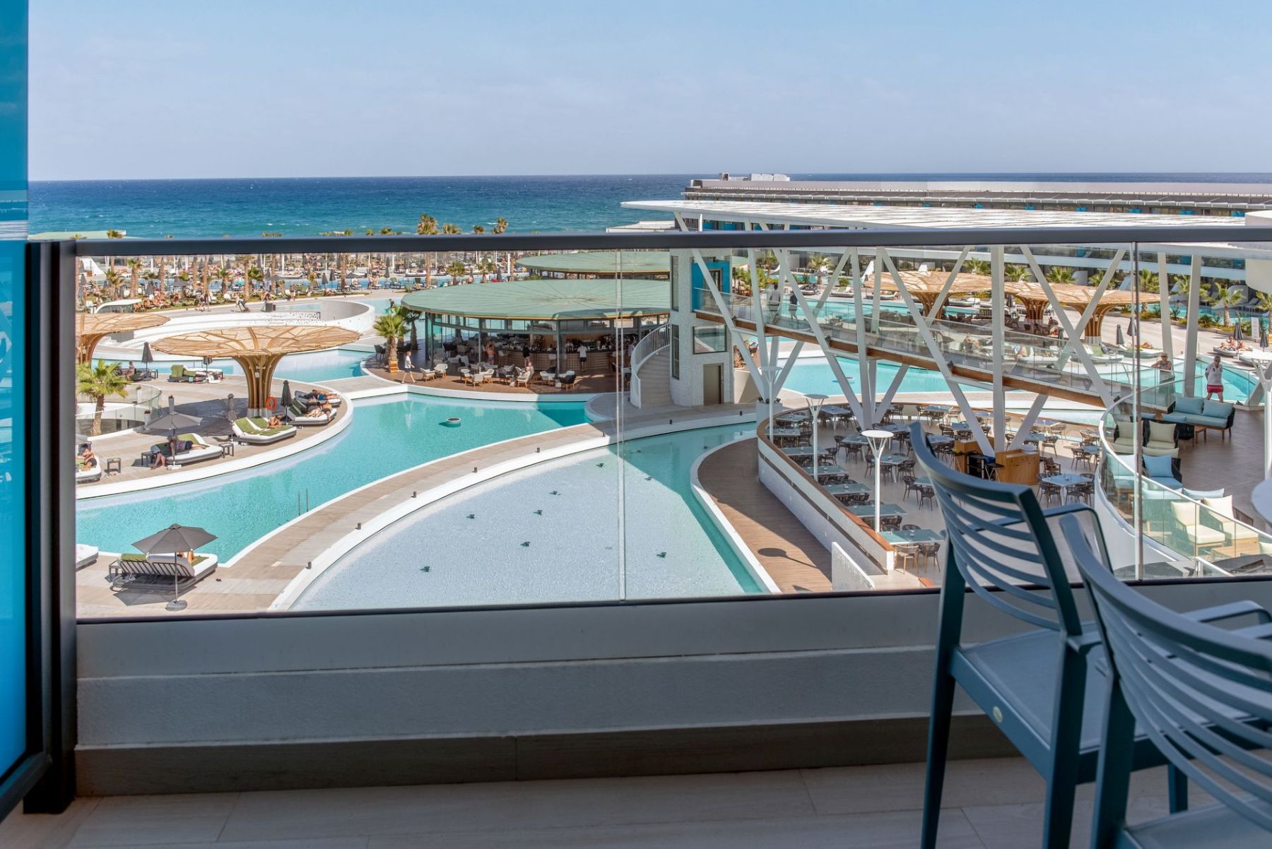 Spacious with modern interiors that blend seamlessly with the light and colors of the Mediterranean, providing guests with a memorable stay. Each suite designed to offer a comfort features one private bedroom with a double bed, a lounge area with a full-sized sofa bed, and a luxurious bathroom with a walk-in shower. Step outside a private furnished balcony, take in the sea breeze and enjoy the beautiful vistas of the sea or the resort’s flowing pools.