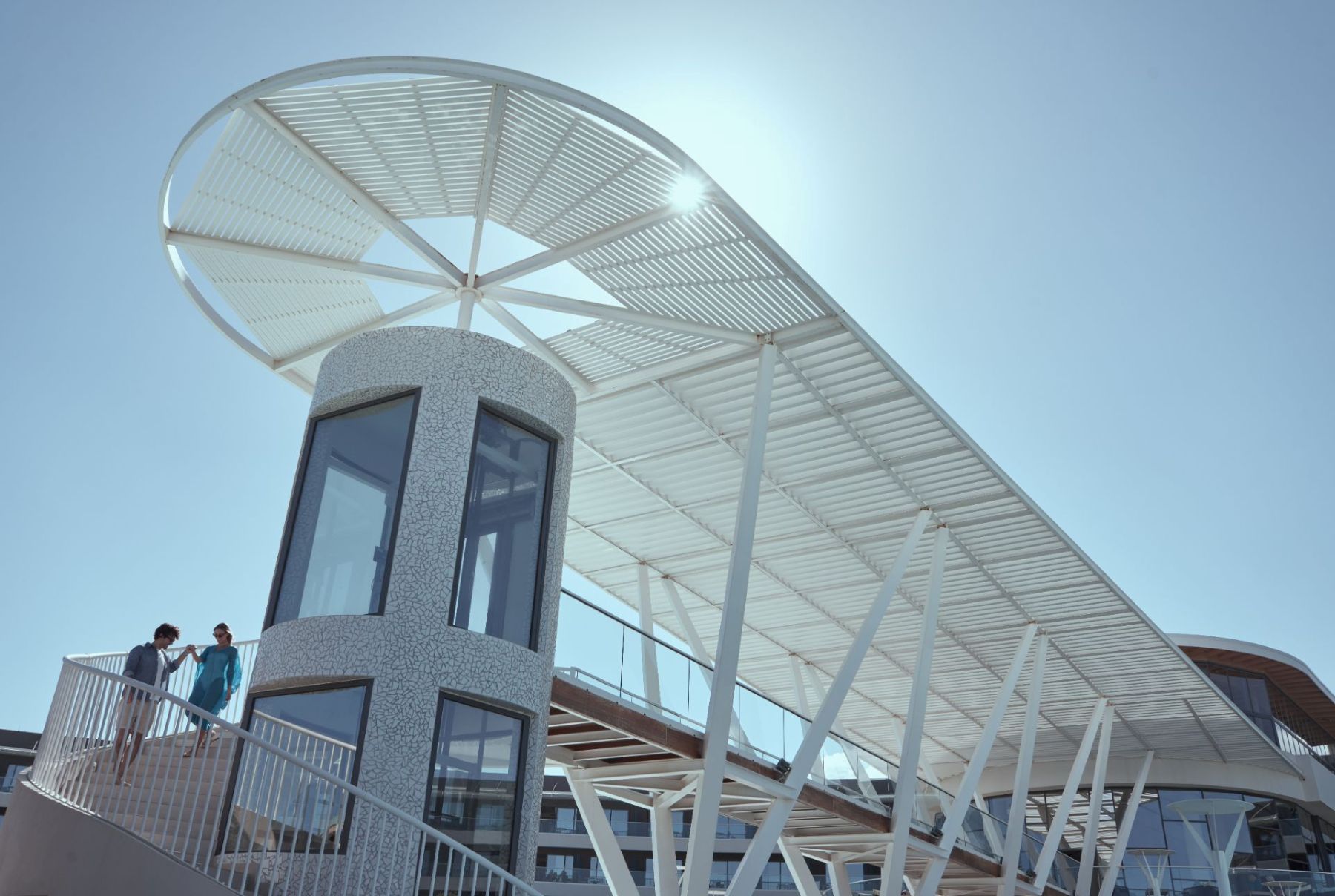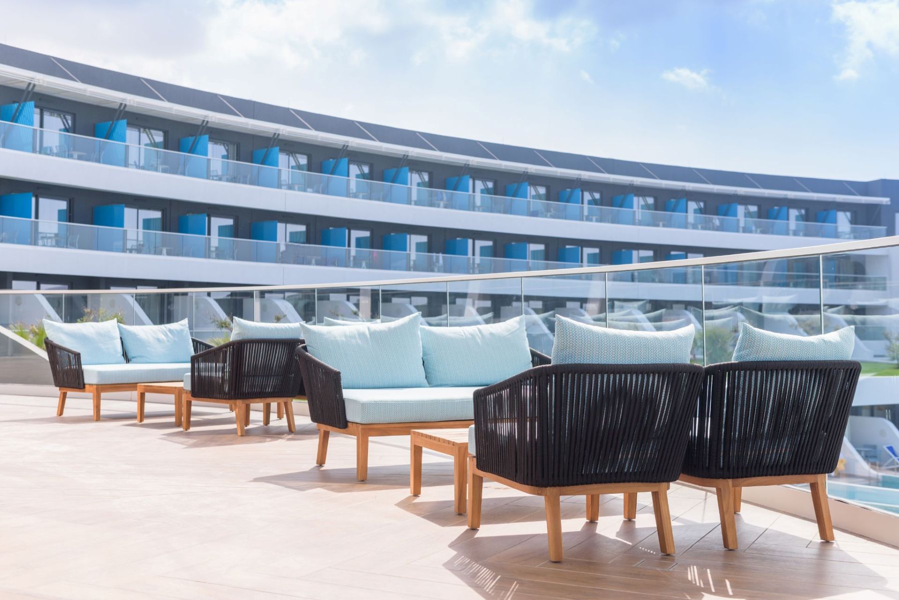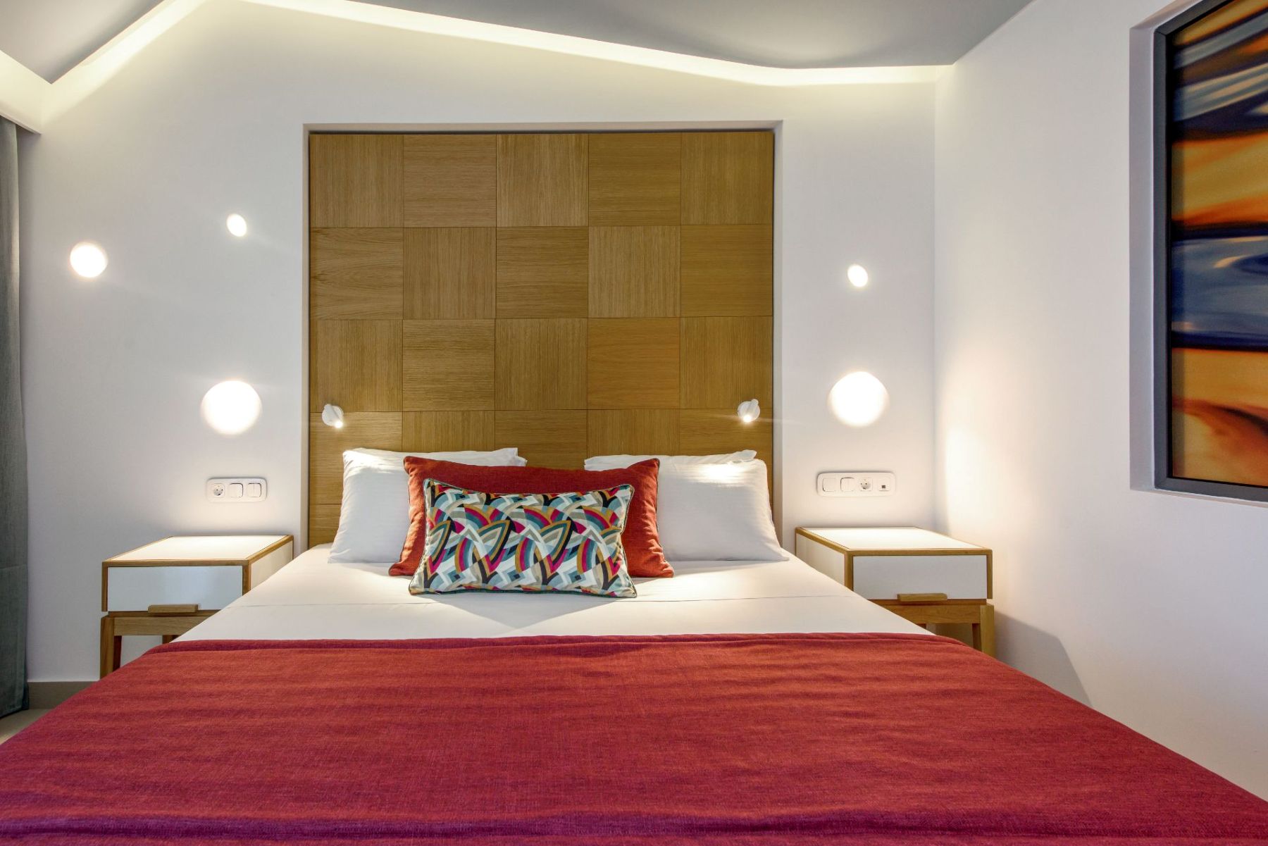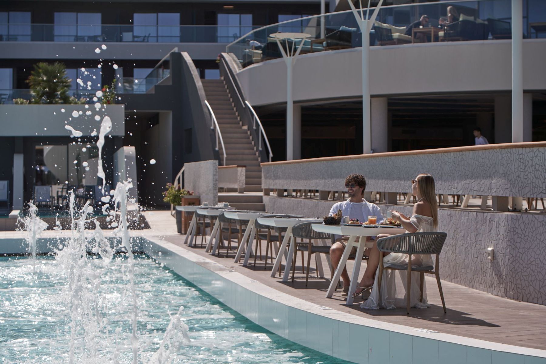 Spacious with modern interiors that blend seamlessly with the light and colors of the Mediterranean, providing guests with a memorable stay. Each suite designed to offer a comfort features one private bedroom with a double bed, a lounge area with a full-sized sofa bed, and a luxurious bathroom with a walk-in shower. Step outside a private furnished balcony, take in the sea breeze and enjoy the beautiful vistas of the sea or the resort’s flowing pools.