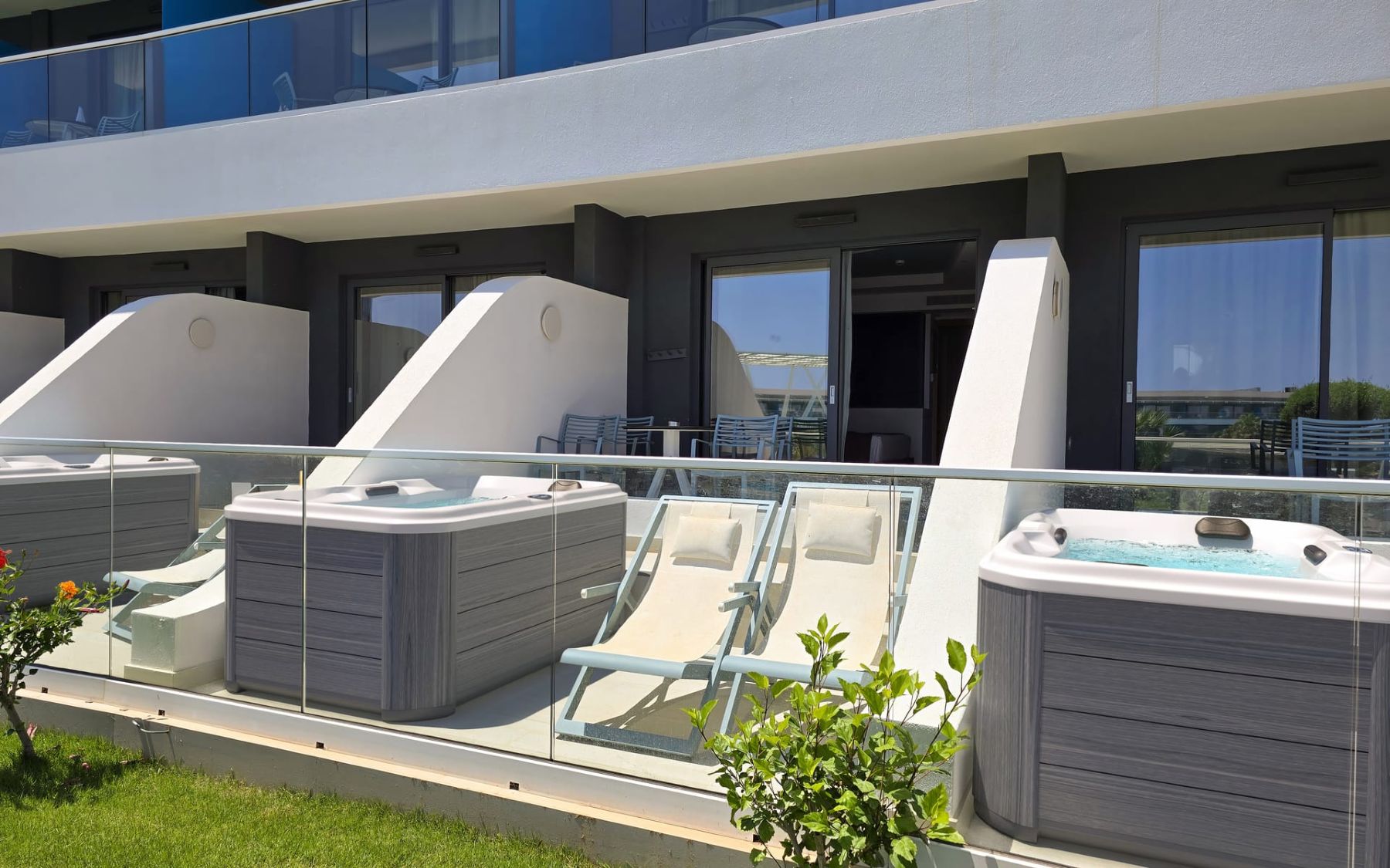 Room facilities: Wi-Fi (free of charge)| Bath amenities| Bathrobes and slippers| Bathroom walk-in shower| Beach/pool towels| Coffee machine with capsules, kettle and tea making facilities in all rooms daily refilled| Drying rack| Electronic room key cards| Electronic safety box (free of charge)| Hair dryer| Ironing Board in all rooms| Makeup – magnifying mirror| Mini fridge in all rooms with free bottled water daily refilled| Microwave upon request (free of charge)| Private balcony or terrace| Outdoor Jacuzzi| Soundproof Windows| Telephone in all rooms and bathrooms| TV in all rooms 50" (flat screen, satellite)| Weight Scale| Writing desk