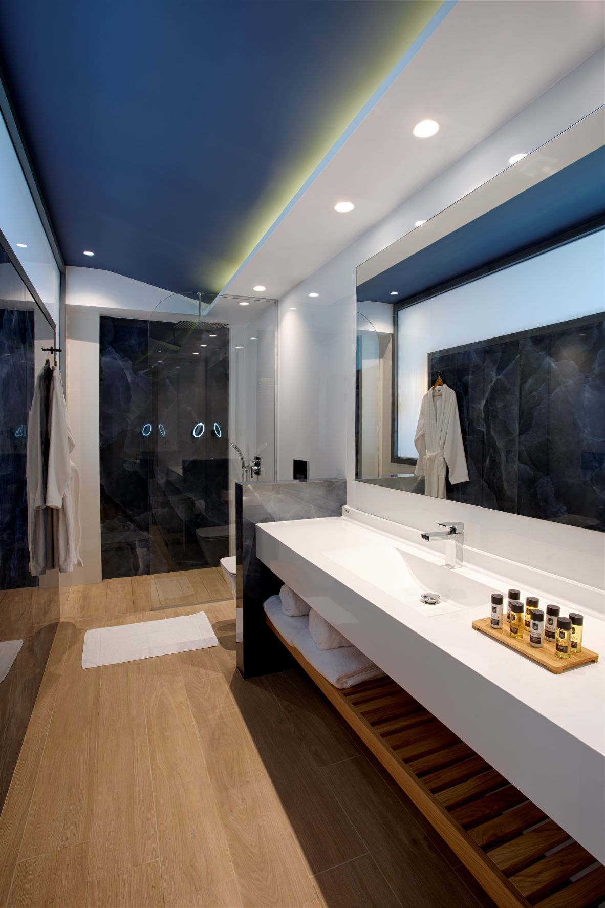 Room facilities: Wi-Fi (free of charge)| Bath amenities| Bathrobes and slippers| Bathroom walk-in shower| Beach/pool towels| Coffee machine with capsules, kettle and tea making facilities in all rooms daily refilled| Drying rack| Electronic room key cards| Electronic safety box (free of charge)| Hair dryer| Ironing Board in all rooms| Makeup – magnifying mirror| Mini fridge in all rooms with free bottled water daily refilled| Microwave upon request (free of charge)| Private balcony or terrace| Soundproof Windows| Telephone in all rooms and bathrooms| TV in all rooms 50" (flat screen, satellite)| Weight Scale| Writing desk