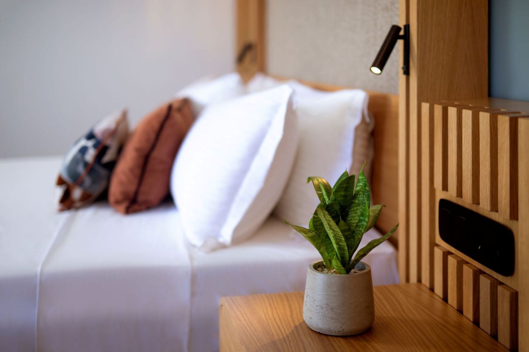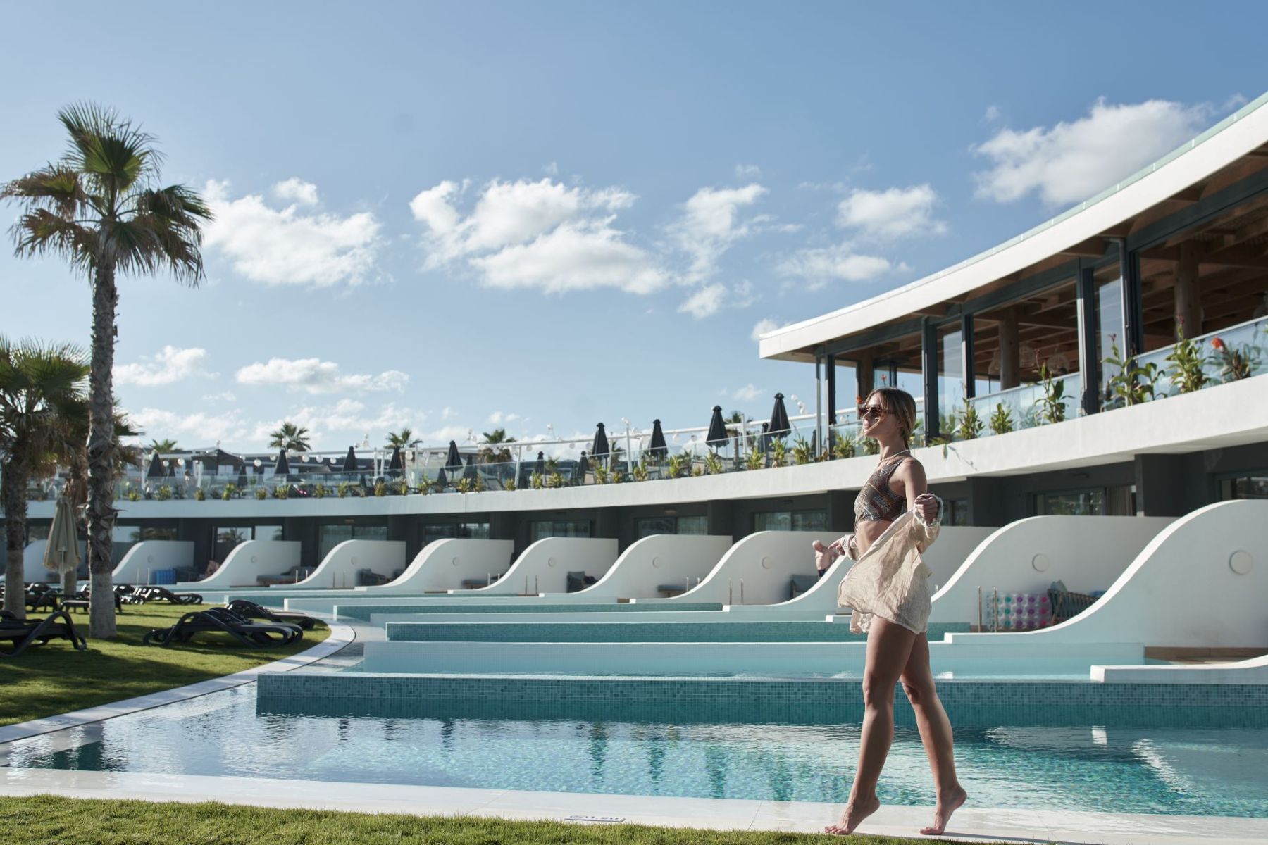 The spacious, light-filled Double Room with natural-colored interior tones provides guests with a blissful and serene stay that combines luxury and comfort. Thoughtfully designed with modern amenities, it features a double bed, a sofa bed, and a luxurious bathroom with a walk-in shower. Once guests step outside onto the private balcony, they can enjoy the alluring views of the pools or the sea.