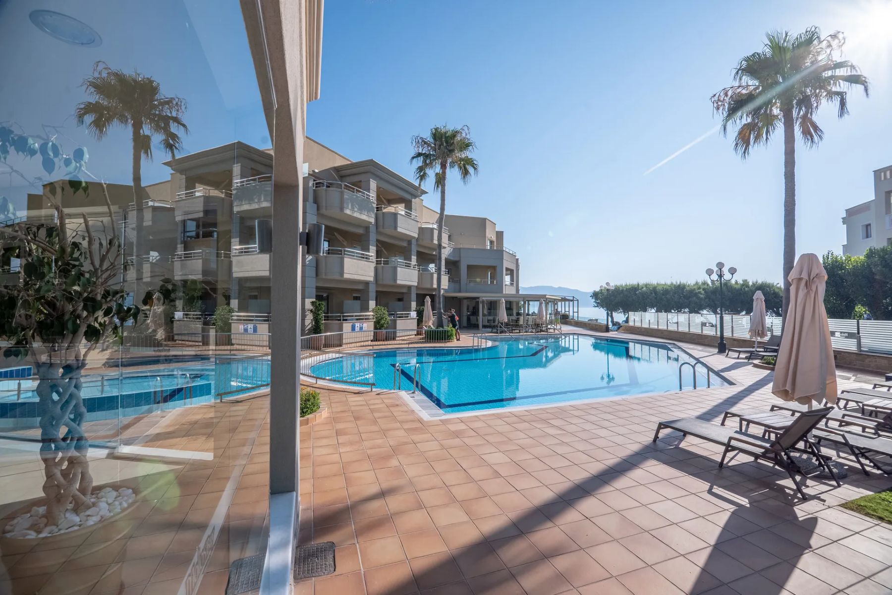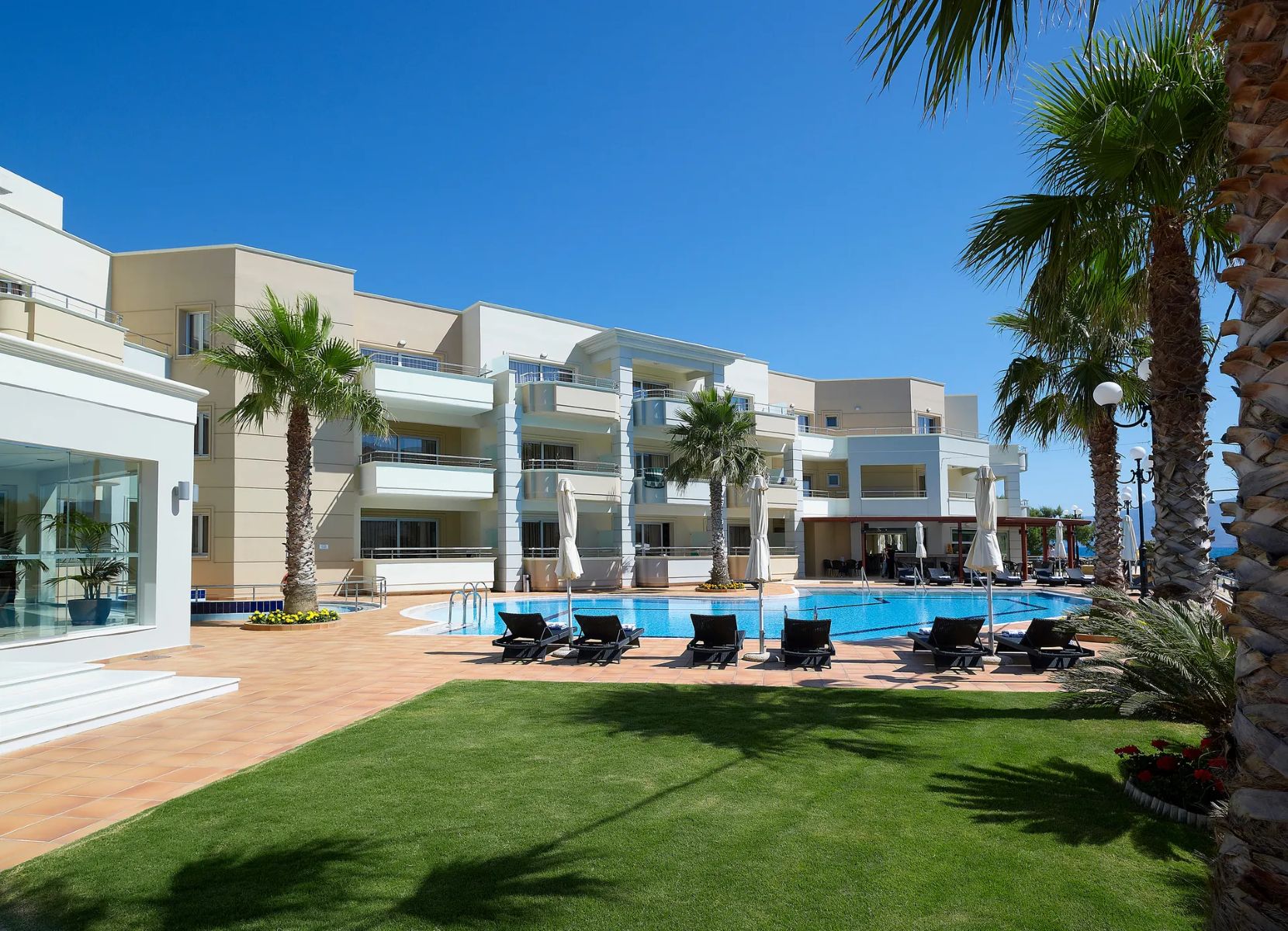 The hotel offers a unique mixture of comfortable and family-friendly accommodation options with a total number of 45 Suites and Junior Suites, as well as a complete holiday experience accomplished by its modern and luxurious services, free open-air pool, fully equipped fitness and wellness facilities, as well as a Cretan traditional breakfast at our all day beach bar– all accompanied by an astonishing view of the deep blue Cretan sea!