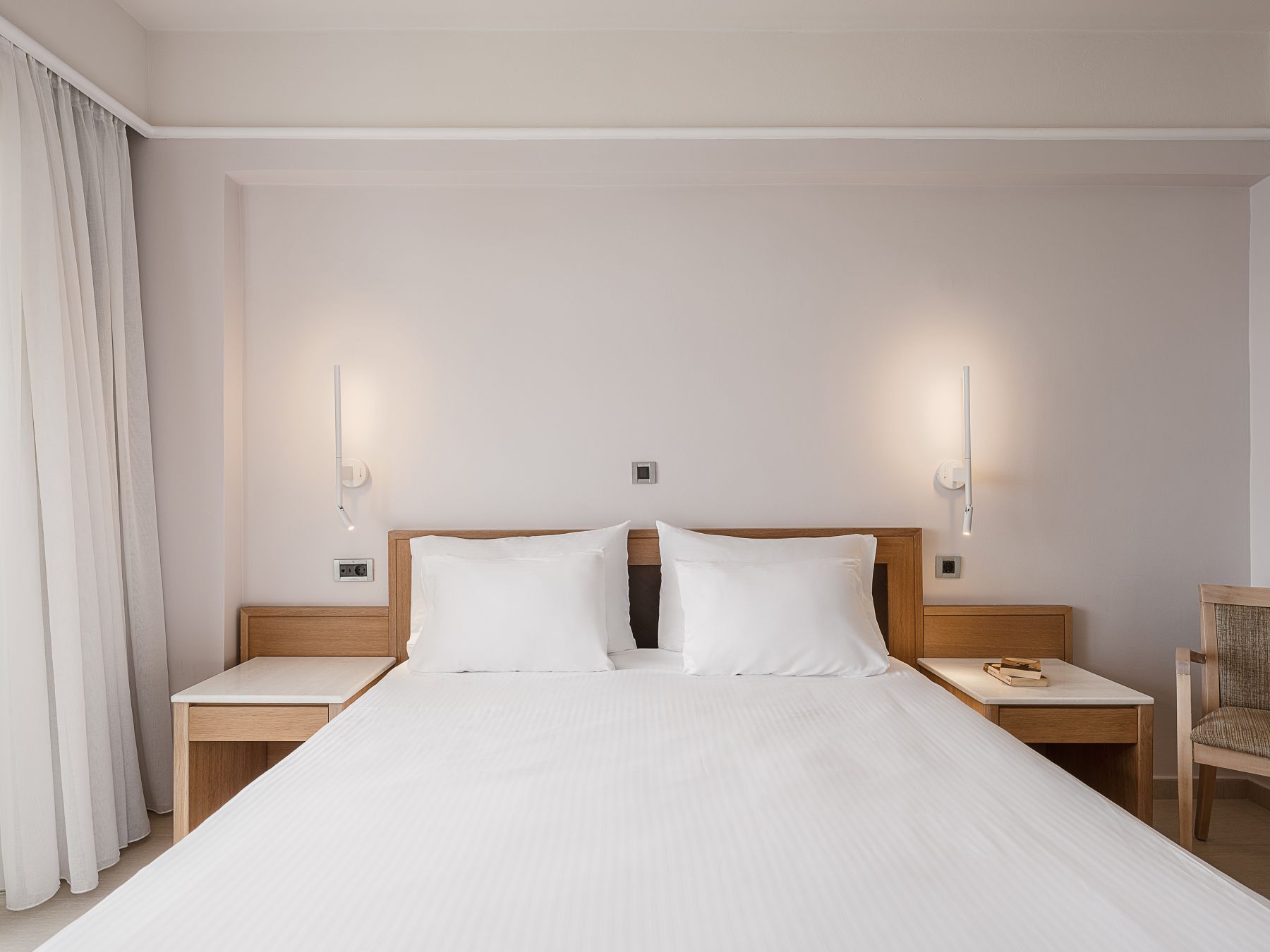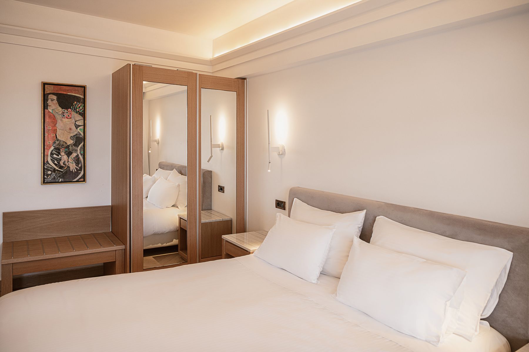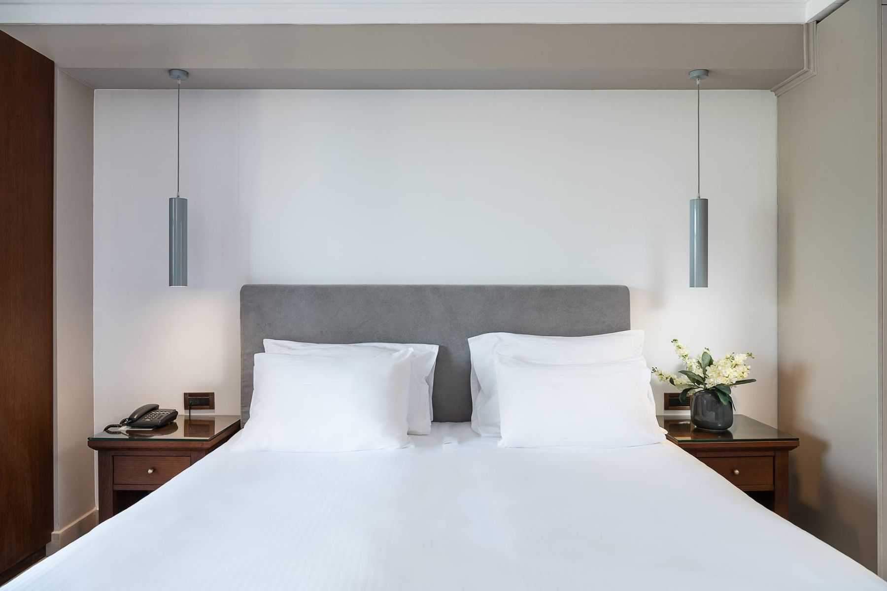 A double room, with twin beds or a double bed, marble bathroom, hair dryer, individually controlled air conditioning, color satellite TV, music channels, direct dial telephone, Internet access (ISDN), mini fridge or mini bar (upon request), safe deposit box and balcony. View: Side Sea view.