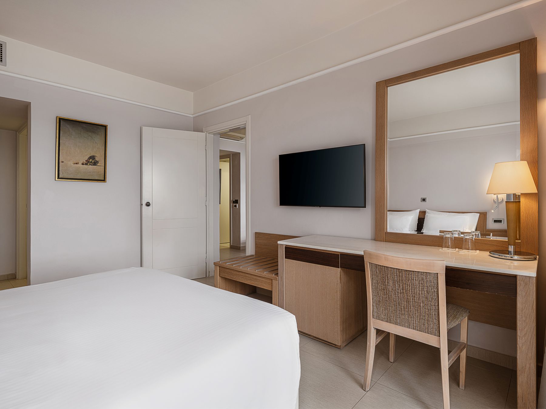 Two-room apartments or maisonettes, consisting of 1 master bedroom with 2 single beds and a separate living room with 2 sofa beds (one single and one double), with a fully equipped kitchenette and refrigerator. They feature a large marble bathroom, hairdryer, individually adjustable air conditioning, satellite TV, music channels, direct dial telephone, WiFi, minibar (on request), safe and balcony or terrace. Maximum capacity: 4 adults or 2 adults and 2 children. View: Pool or Garden view.