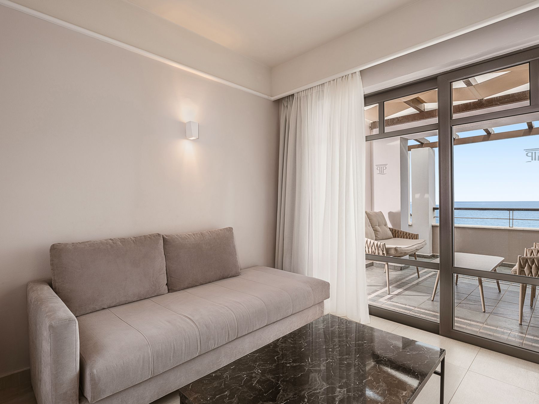 A spacious one bedroom apartment with a sofa bed and a fully equipped multi-kitchenette and fridge, a large marble bathroom, hair dryer, individually controlled A/C, color Satellite TV, music channels, direct dial telephone, Internet access (ISDN), mini bar (available upon request), safe deposit box and balcony or veranda. Maximum capacity: 3 adults or 2 adults and 1 child. View: Side Sea view.