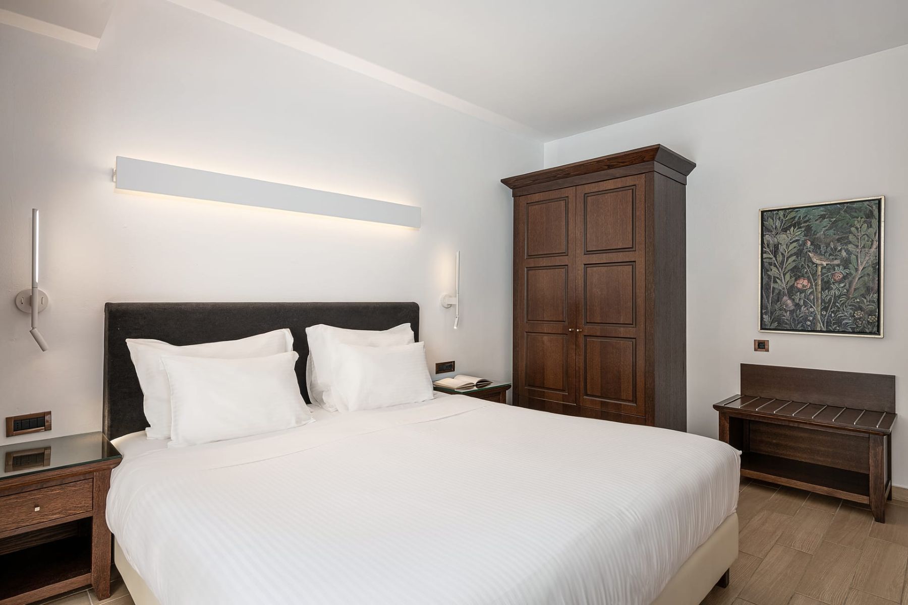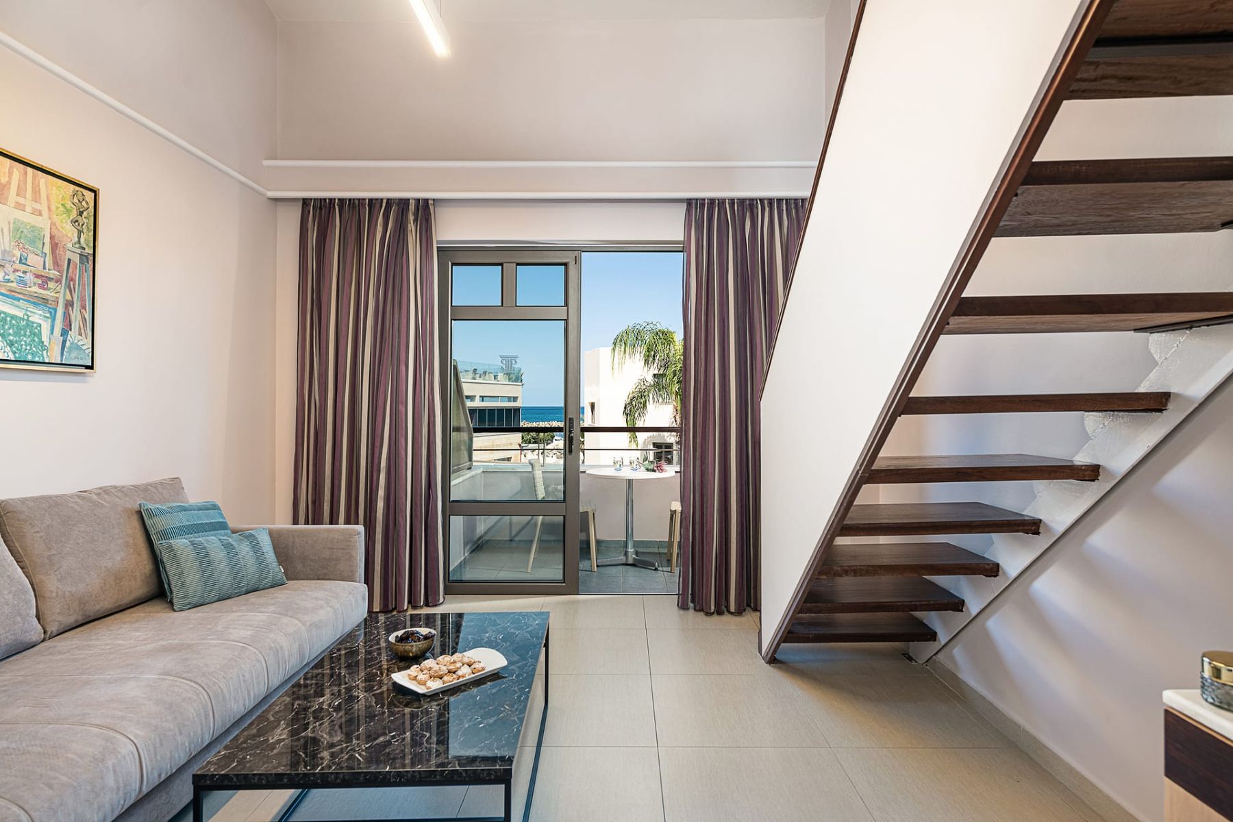 Split-level rooms consisting of a living room with 2 sofa beds (one single and one double bed) on the lower level and a twin-bedded main bedroom on the upper level communicating by means of an internal wooden staircase. With a large marble bathroom featuring a separate shower and bathtub, hair dryer, individually controlled air conditioning, color satellite TV, music channels, direct dial telephone, Internet access (ISDN), mini fridge or mini bar (upon request), safe deposit box and balcony or veranda. View: Pool or Garden view.