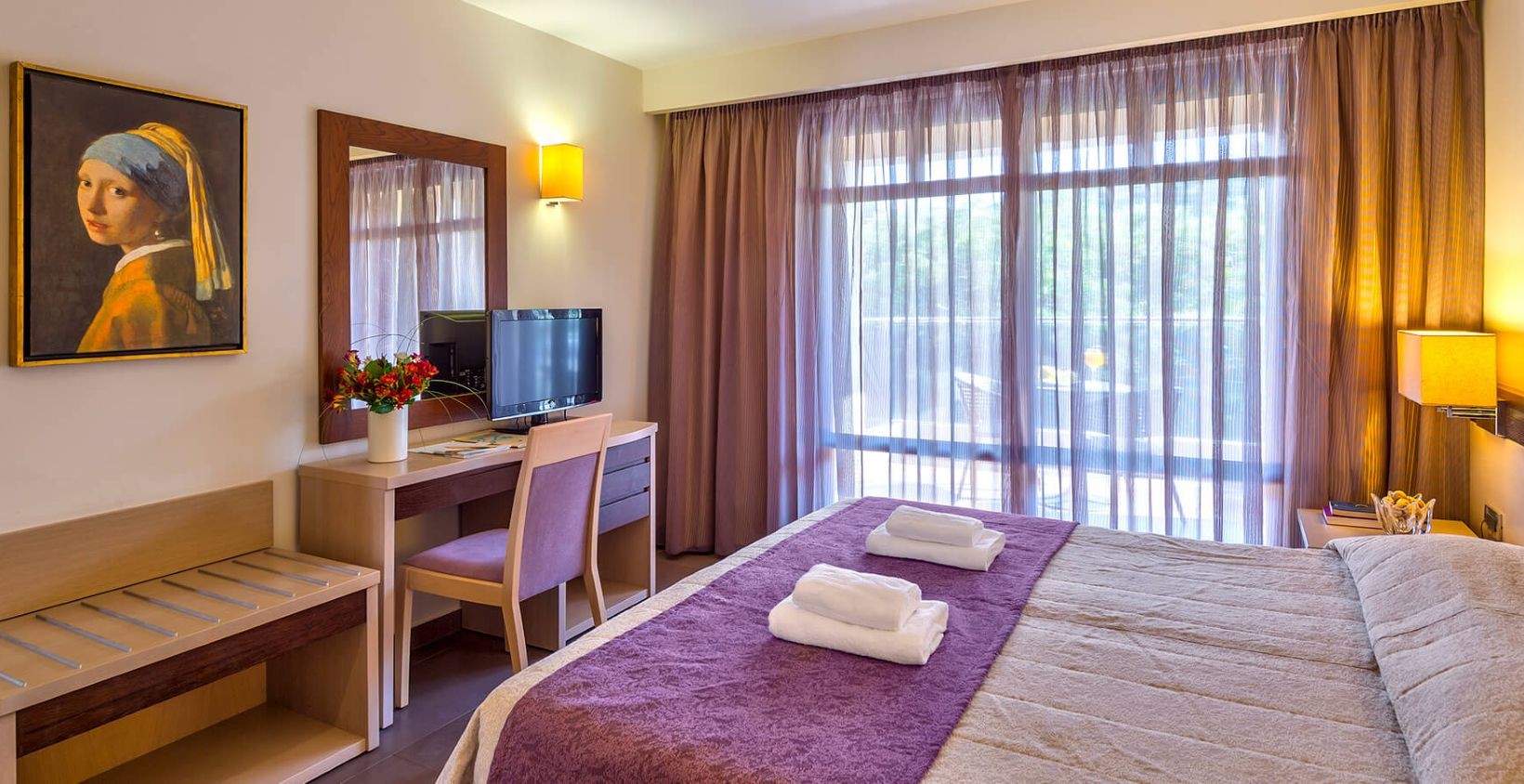 Standard double room, with twin beds or a double bed, marble bathroom, hair dryer, individually controlled air conditioning, color satellite TV, music channels, direct dial telephone, Internet access (ISDN), mini fridge or mini bar (upon request), safe deposit box and balcony. View: Pool or Garden view.