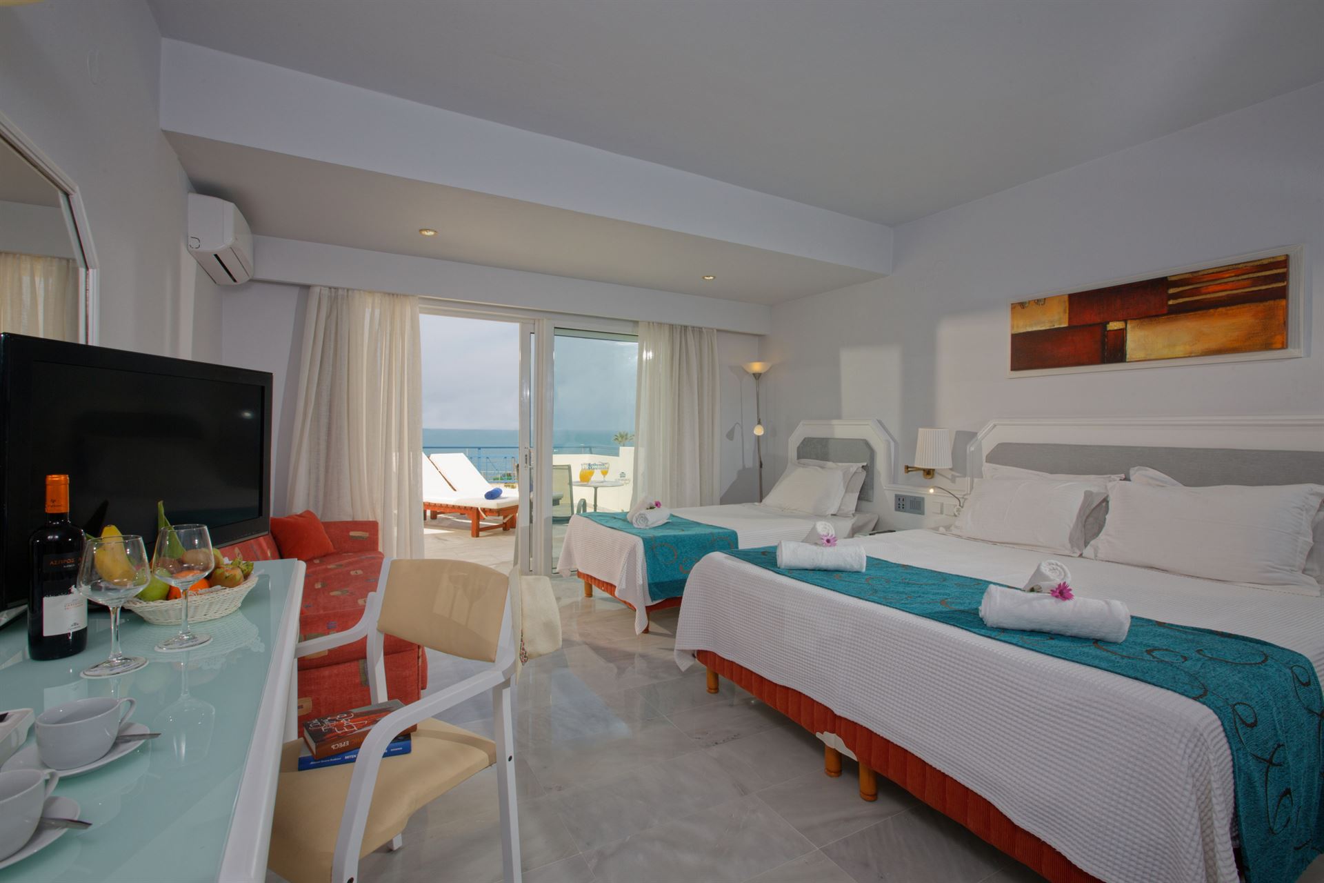 Completely updated ideally located elegant guest rooms boast amazing views of the Cretan Sea.Open plan master bedroom with a king size bed & and the stylish decoration provide an ideal holiday retreat. Sea view Rooms feature a private bathroom, floor to floor ceiling windows overlooking the sea furnished balcony with panoramic views.
