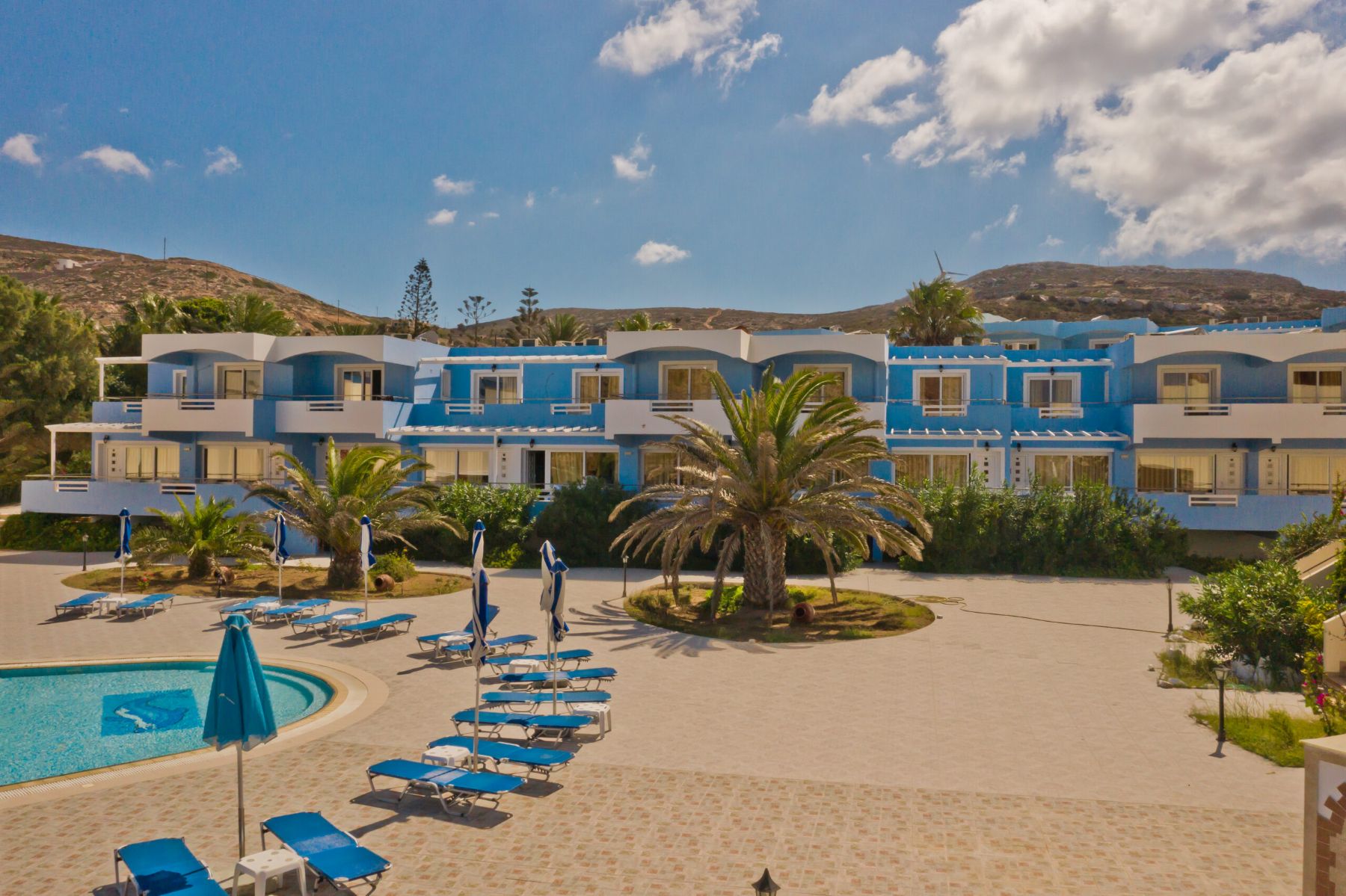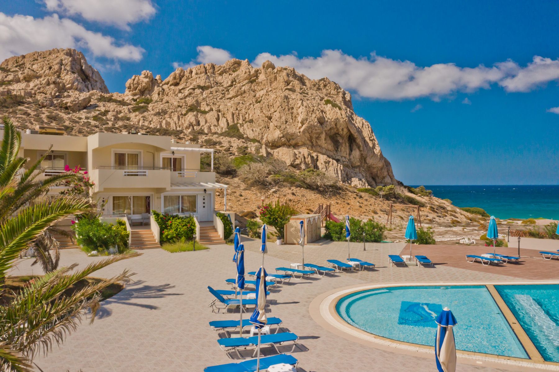 Royal Beach Hotel is the place where luxury and tranquility meet on the breathtaking shores of beach St. Nicolas. Nestled along the pristine coastline, the hotel is the perfect destination for travelers seeking a memorable escape. It sits only two minutes’ walking distance from the famous, award-winning St. Nicolas beach, which boasts crystal-clear waters and a beautiful sunset every day. The hotel is conveniently located 800 m away from the center of Arkasa Village, 16 km from the capital, Pigadia Town, and 10.5 km from the airport.