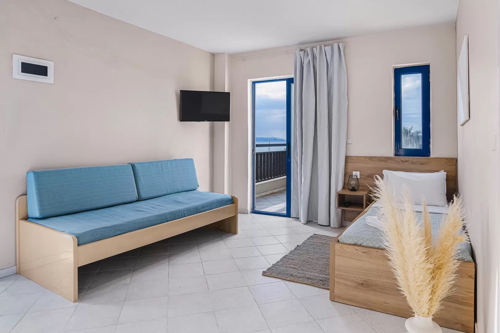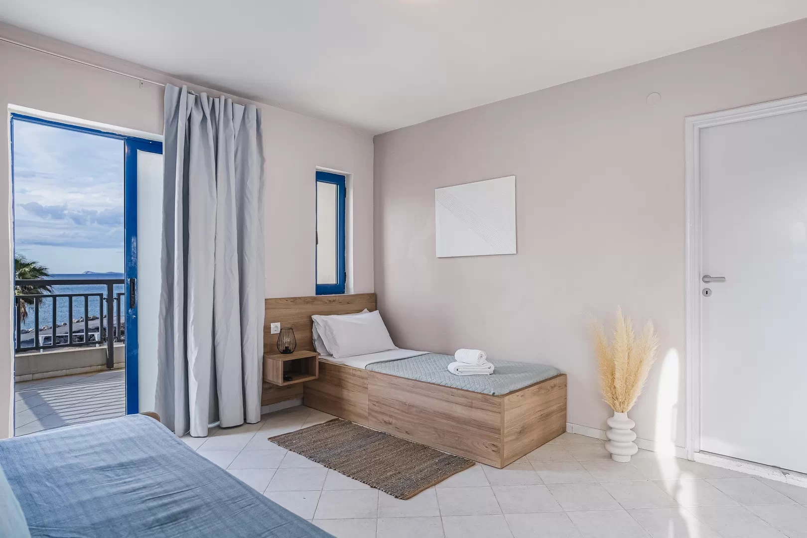 Our Sea View Apartments constitute an ideal choice for thise who wish to enjoy the crystal waters at the beach throughout the day. Their two spacious bedrooms can accommodate up to four people, while their minimalist style and simple decor create an environment of pure harmony, adding to the comfort provided with each stay. – 2 Spacious room – Sea view – Fridge