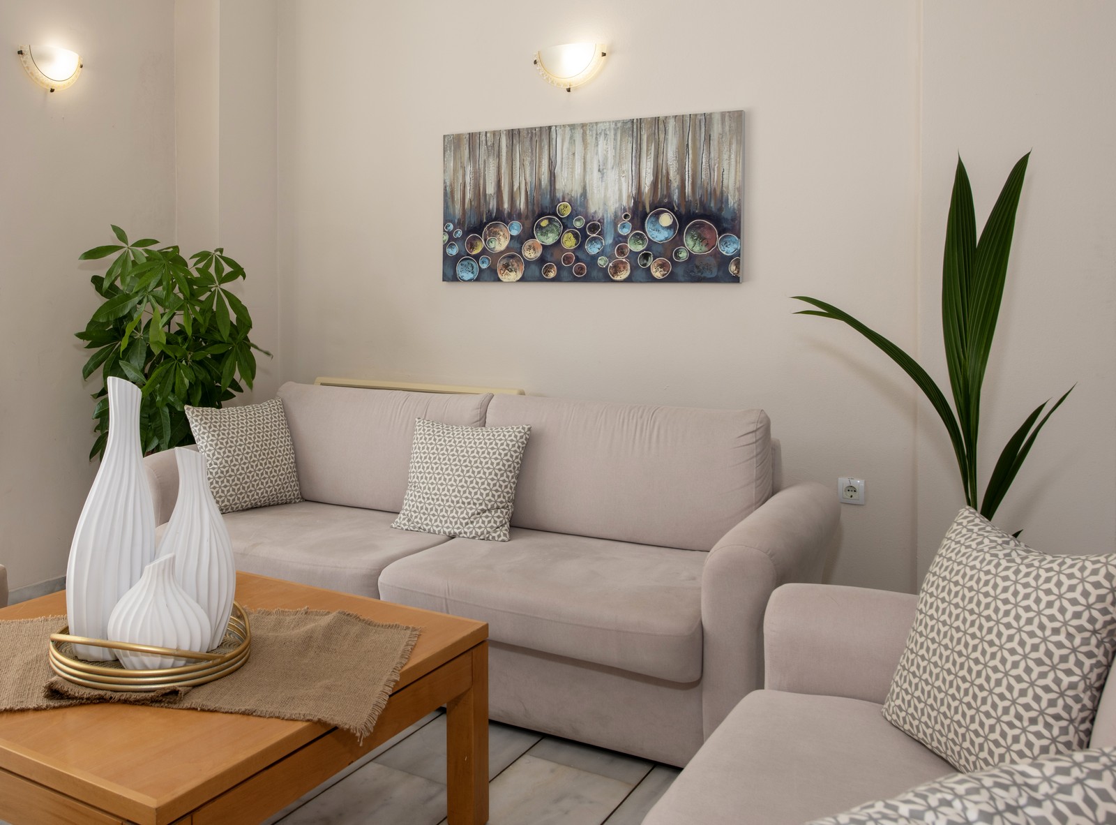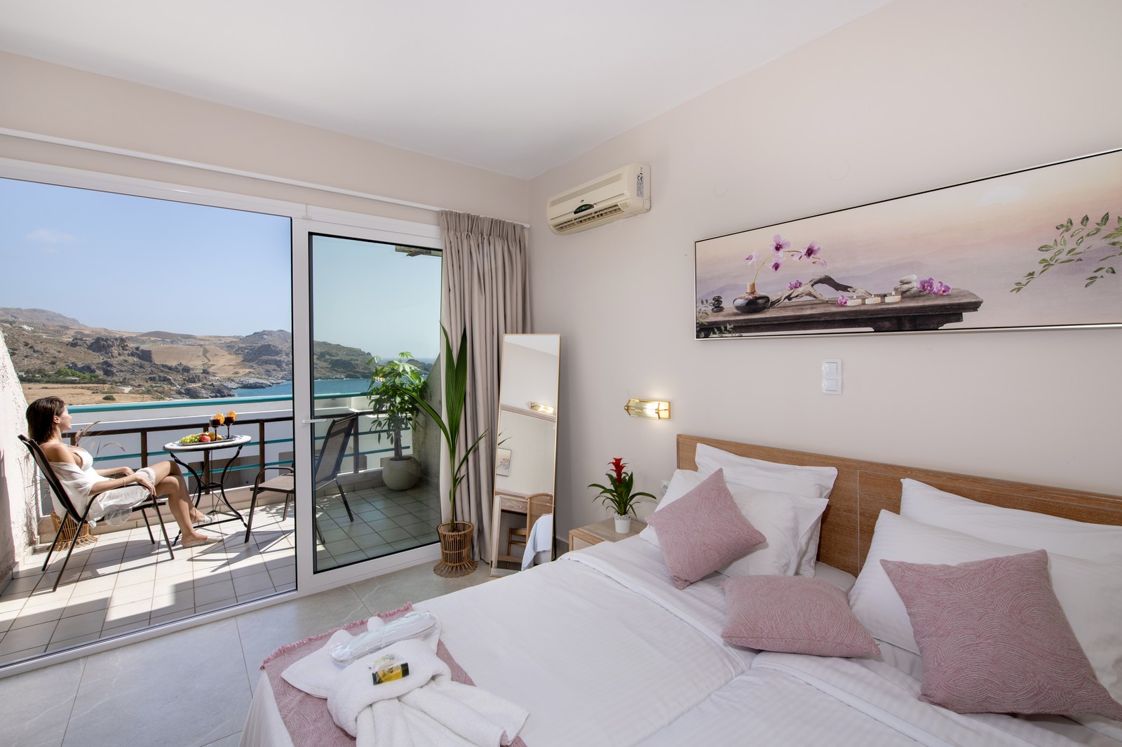 Номер состоит из спальной комнаты с двуспальной или двумя односпальными кроватями с постельным бельем и выбором подушек для Вашего комфортного отдыха и сна, мини-холодильника, чайника, ванной комнаты с душем и туалетными принадлежностями, изготовленными из экологически чистых материалов. Также в номере есть два удобных кресла и просторный балкон с прекрасными видами.